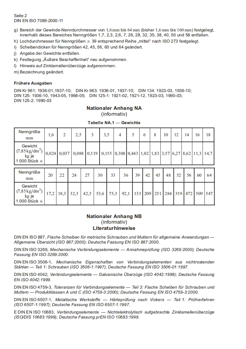 DEUTSCHE NORMNovember 2000Flache ScheibenNormale Reihe.ProduktklasseDIN(1S07089:2000)Deutsche Fassung EN ISO 7089:2000EN ISO 70891CS21.060.30MitDIN EN ISO7090:2000-11Plain washers -Normal series.Ersatz furProduct grade A(ISO 7089:2000);DIN125-1:1990-03undGerman version EN ISO 7089:2000DIN125-2:1990-03Rondelles plates-Serie normale,Grade A(S07089:2000):Version allemande EN ISO 7089:2000Die Europaische Norm EN ISO 7089:2000 hat den Status einer Deutschen Norm.Nationales VorwortDiese Norm ist identisch mit der Europaischen Norm EN ISO 7089,in diedie Internationale NormISO 7089 unverandert ubernommen wurde.Diese Europaische Norm wurde unter Mitwirkung des Arbeitsausschusses FMV-4.4.Scheiben undRinge"erstellt.Mit der Veroffentlichung dieser Europaischen Norm sind einige Anderungen verbunden,auf die imAbschnitt Anderungen"hingewiesen wird.Eine dieser Anderungen ist der Wegfall der Gewichte.Derzustandige Ausschuss hat deshalb beschlossen,diese im nationalen Teil der Norm zur Informationanzugeben,siehe Nationaler Anhang NA,Tabelle NA.1.In Fallen,in denen sich ScheibenmaBegeandert haben,wurden auch die Gewichte geandert.Fur die im Abschnitt 2 zitierten Intemationalen Normen wird im Folgenden auf die entsprechendenDeutschen Normen hingewiesen:1S0887siehe DIN EN ISO 8871S03269siehe DIN ISO 3269ISO 3506-1 siehe DIN EN ISO 3506-1ISO 4042 siehe DIN EN ISO 4042ISO 4759-3 siehe DIN EN ISO 4759-3ISO 6507-1 siehe DIN EN ISO 6507-1ISO 10683 siehe E DIN EN ISO 10683AnderungenGegenuber DIN 125-1:1990-03 und DIN 125-2:1990-03 wurden folgende Anderungen vorgenommen:a)Normnummer geandert.b)Titel geandert.c)Norm neu gegliedertd)Ausfuhrung mit Innenfase entfallen.e)Harteklasse 140 HV entfallen.f)NenngroBen auf der Basis des Gewindedurchmessers(nicht des Lochdurchmessers)festgelegt.Fortsetzung Seite 2und 6 Seiten ENNormenausschuss Mechanische Verbindungselemente(FMV)im DIN Deutsches Institut fur Normung e.V.