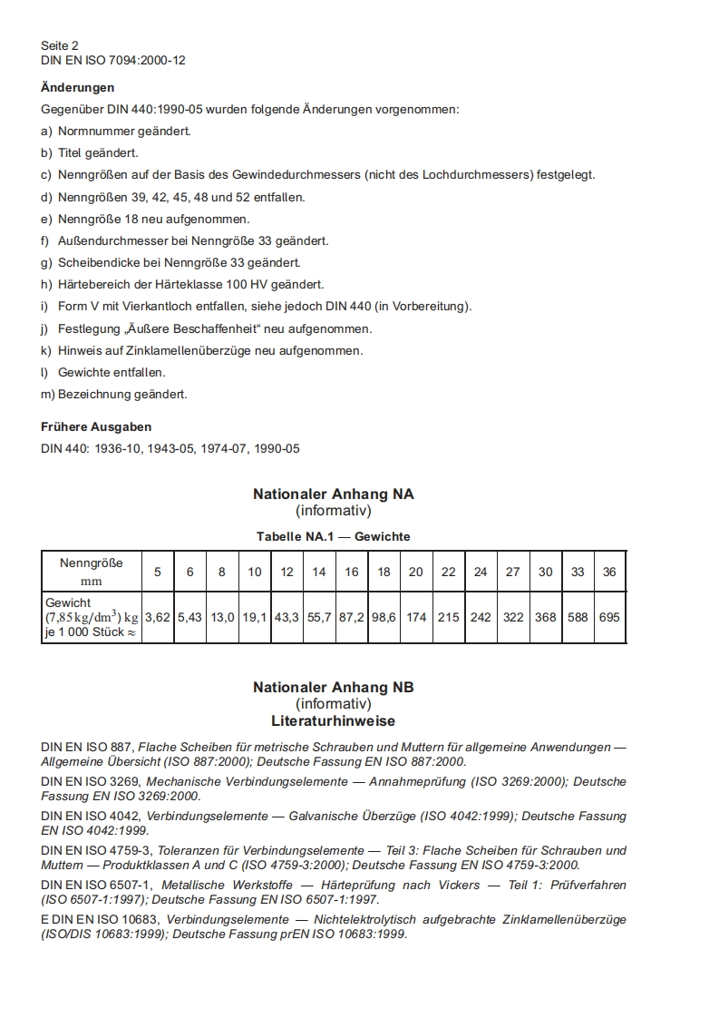 DEUTSCHE NORMDezember 2000Flache ScheibenExtra groBe Reihe,Produktklasse C(1S07094:2000)Deutsche Fassung EN ISO 7094:2000EN ISO 70941CS21.060.30Teilweise Ersatz furD1N440:1990-05Plain washers-Extra large series,Product grade C(1S07094:2000:German version EN ISO 7094:2000Rondelles plates-Serie tres large,Grade C(1S07094:20005Version allemande EN ISO 7094:2000Die Europaische Norm EN ISO 7094:2000 hat den Status einer Deutschen Norm.Nationales VorwortDiese Norm ist identisch mit der Europaischen Norm EN ISO 7094,in diedie Internationale NormISO 7094 unverandert ubernommen wurde.Diese Europaische Norm wurde unter Mitwirkung des Arbeitsausschusses FMV-4.4.Scheiben undRinge"erstellt.In Tabelle 2 weicht die Deutsche Fassung in folgenden Werten von der ISO 7094:2000-06-01 ab:NenngroBe 18:dimax=20,84 mm(1S07094:dimax =20,43 mm)NenngroBe 22:hmin=5mm(1S07094:hmin=4mm)Deutschland hat die Korrektur der o.g.Werte der ISO beantragt.Die Werte sind in Tabelle 2 durcheine nationale FuBnote gekennzeichnetFur extra groBe Scheiben mit Vierkantloch ist eine Neuausgabe der Norm DIN 440 in Vorbereitung.Mit der Veroffentlichung dieser Europaischen Norm sind einige Anderungen verbunden,auf die imAbschnitt,Anderungen"hingewiesen wird.Eine dieser Anderungen ist der Wegfall der Gewichte.Derzustandige Ausschuss hat deshalb beschlossen,diese im nationalen Teil der Norm zur Informationanzugeben,siehe Nationaler Anhang NA,Tabelle NA.1.In Fallen,in denen sich ScheibenmaBe gean-dert haben,wurden auch die Gewichte geandert.Fur die im Abschnitt 2 zitierten Intemationalen Normen wird im Folgenden auf die entsprechendenDeutschen Normen hingewiesen:1S0887siehe DIN EN ISO 887ISO 3269 siehe DIN ISO 3269IS04042siehe DIN EN ISO 4042ISO 4759-3 siehe DIN EN ISO 4759-3ISO 6507-1 siehe DIN EN ISO 6507-11S010683siehe E DIN EN ISO 10683Fortsetzung Seite 2und 5 Seiten ENNormenausschuss Mechanische Verbindungselemente(FMV)im DIN Deutsches Institut fur Normung e.V.