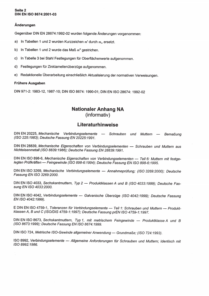 DEUTSCHE NORMMarz 2001Sechskantmuttern,Typ 2,mit metrischem FeingewindeProduktklassen A und BDINIS08674:1999)Deutsche Fassung EN 8674:2000EN ISO 86741CS21.060.20Ersatz furDIN EN28674:1992-02Hexagon nuts,style 2.with metric fine pitch thread-Product grades A and B(ISO 8674:1999);German version EN 8674:2000Ecrous hexagonaux,style 2,a filetage metrique a pas fin-Grades A et B(ISO 8674:1999);Version allemande EN 8674:2000Nationales VorwortDiese Norm ist identisch mit der Europaischen Norm EN ISO 8674,in die die Internationale NormISO 8674 unverandert ubernommen wurde.Diese Europaische Norm wurde unter Mitwirkung des Arbeitsausschusses FMV-3.1Schrauben und Mut-tern mit AuBenantrieb"erstellt.Fur die im Abschnitt 2 zitierten Intemnationalen Normen wird im Folgenden auf die entsprechenden Deut-schen Normen hingewiesen:IS0225siehe DIN EN 202251S0724siehe DIN ISO 7241S0898-6siehe DIN EN ISO 898-61s03269siehe DIN EN ISO 3269IS04033siehe DIN EN ISO 40331S04042siehe DIN EN ISO 4042ISO/DIS 4759-1 siehe E DIN EN ISO 4759-11S08673siehe DIN EN ISO 86731S08839siehe DIN EN 288391S08992siehe DIN ISO 8992Fortsetzung Seite 2und 8 Seiten ENNormenausschuss Mechanische Verbindungselemente(FMV)im DIN Deutsches Institut fur Normung e.V.DIN Deutsches institut for Normung e.V.-Jede Art der Vervielfaltigung,auch auszugsweise,Ref.Nr.DIN EN ISO 8674:2001-03V..Berlin,gestattet.Preisgr.08Vertr.-Nr.2308