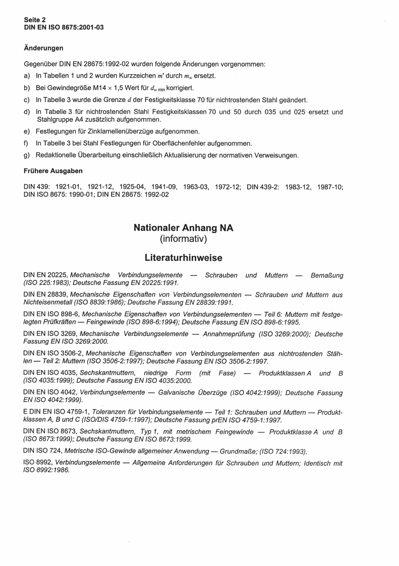 DEUTSCHE NORMMarz 2001Niedrige Sechskantmuttern(mit Fase)mit metrischem FeingewindeProduktklassen A und B(ISO 8675:1999)Deutsche Fassung EN ISO 8675:2000EN ISO 86751CS21.060.20Ersatz furDIN EN28675:1992-02Hexagon thin nuts(chamfered)with metric fine pitch thread-Product grades A and B(ISO 8675:1999):German version EN ISO 8675:2000Ecrous bas hexagonaux(chanfreines)a filetage metrique a pas fin-Grades A et B(ISO 8675:1999);Version allemande EN ISO 8675:2000Nationales VorwortDiese Norm ist identisch mit der Europaischen Norm EN ISO 8675,in die die Internationale NormISO 8675 unverandert ubernommen wurde.Diese Europaische Norm wurde unter Mitwirkung des Arbeitsausschusses FMV-3.1Schrauben und Mut-tern mit AuBenantrieb"erstellt.Fur die im Abschnitt 2 zitierten Internationalen Normen wird im Folgenden auf die entsprechenden Deut-schen Normen hingewiesen:1S0225siehe DIN EN 202251S0724siehe DIN ISO 7241S0898-6siehe DIN EN ISO 898-61S03269siehe DIN EN ISO 32691S04035siehe DIN EN ISO 40351S04042siehe DIN EN ISO 4042ISO/DIS 4759-1 siehe E DIN EN ISO 4759-11S08839siehe DIN EN 288391S08992siehe DIN ISO 8992Fortsetzung Seite 2und 8 Seiten ENNormenausschuss Mechanische Verbindungselemente(FMV)im DIN Deutsches Institut fur Normung e.V.DIN Deutsches Institut fur Normung e.V.Jede Art der Vervielfaltigung.auch auszugsweise,Ref.Nr.DIN EN ISO 8675:2001-03Aciam878er29e2NeCasC8e68rT6972B8a8V.8emgsataPreisgr.08Vertr.-Nr.2308