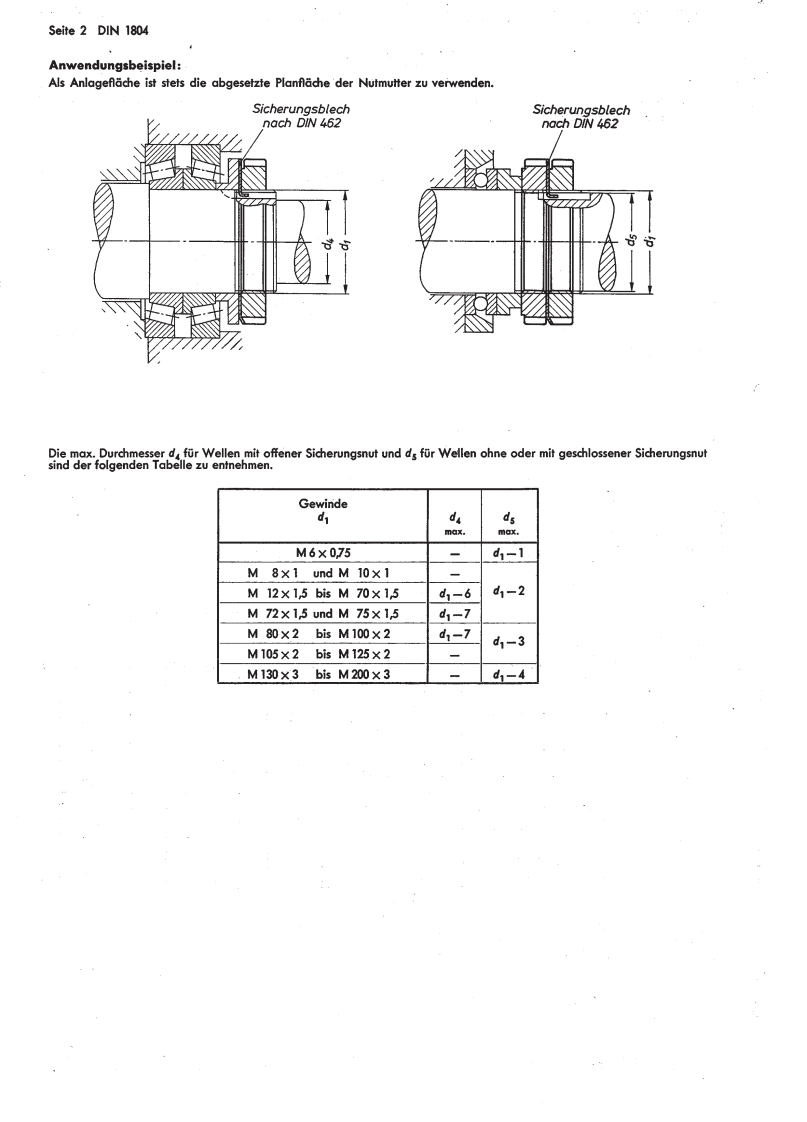 DK621.882.37.082.11:621.9DEUTSCHE NORMENMarz197八Nutmuttern瓜Metrisches ISO-Feingewinde1804Slotted round nut for hook spannerMaBe in mmW(W)AOberfachen Reihe 2 DIN 3141Kanten gebrochen8o0ZA☑T6AIITSBBezeichnung einer Nutmutter mit Gewinde d=M120x 2,Ausfuhrung gehartet(h):Nutmutter M 120 X 2 DIN 1804-hGewindeAn-GewindeAn-bzahldderbNutenNuten4Hh144Hh11b14M6×0,75161245T50575M8×12164150509255851042,6490,5639M10×12525620517468×1,54410M12×15256052,17M70×1510090405418M14×1,53255705428672×15571M16×153572500100543,14M75×1,51106540M18×1542868,5054380M80×2115105101646576M20×1,5366825054.13M85×21201101016468,0M22×15346920545.90M90×21301201016416843M24×1505630M95×21351201215186.0M26×1,53810304782M100×21451301216561046M28×1,510,1M105×2123M30×1,543710305935M110×215514012165113M32×15524511054108MI15×2150M35×1,548711305417M120×21651501218137M38X15585083505412,3M125×2178M40×1,562541235051591801655167M42X158M130×3147M140×31951801218518200M45×1,568608123505618,1M150×3205190l121851212M48X15M50×1575683505253M160X36220205122051278238M170×3230210162078285M52X15180701013405275M180X3245225162078330M55×1,525,TM190×3260240162078377M58×1,5360M200×32702501622436M60X1,580405634,1Werkstoff (Festigkeitsklasse):mindestens 5 nach DIN 267 Blatt 4Ausfuhrung:w ungehartet und ungeschliffenh gehartet HRC60+2 mit Ausnahme des Gewindes,Planflachen geschliffenHakenschlussel siehe DIN 1810Fortsetzung Seite 2FachnormenausschuB Werkzeugmaschinen im Deutschen NormenausschuB(DNA)f der Normblater durch Beuth-Vertrieb GmbH,Berlin 30 und KolnDIN 1804 Marz 1971 Preisgr.