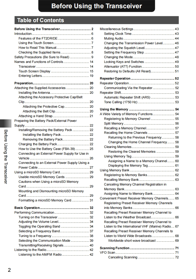 YAESUThe radioFT2DR/DE144/430MHzDIGITAL/ANALOGTRANSCEIVEROperating ManualC4FM/FMBefore Using the TransceiverPreparationBasic OperationYAESURepeater Operation123146.520Using the MemoryaH江446.500Scanning FunctionFMUOLLEH江s■Digital Group Monitor FunctionFM四TXDNMODEUsing the APRS FunctionsDigitalFT2DUsing the WIRES-X FunctionsUsing the GPS FunctionBACKDISPBANDA/BV/MConvenient FunctionsCommunicating with aSpecific Remote StationCustomize Menu Settings forIndividual Use(Set Mode)Functions to Use a NecessaryAppendix