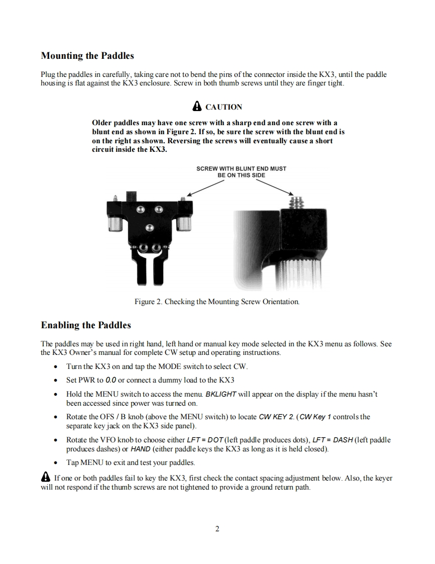 Elecraft KXPD3 Precision Keyer PaddlesRevision F,April 27,2017E740166Copyright 2017,Elecraft,Inc.,All Rights ReservedThe KXPD3 paddles are designed for use with the KX3 transceiver.They mount directly on the KX3 to providesmooth,stable and compact operation anywhere with the KX3 sitting flat or standing on its tilt feet.Each paddlefeatures fully adjustable contact spacing.SPOTCWT 4 PITCH 5NTCH32Figure 1.KXPD3 Paddles Mounted on KX3.Parts IncludedIncluded with your fully assembled KXPD3 paddles are the following wrenches and springs that you can use tocustomize the feel of your paddles.Full instructions for doing so are included on the following pages.KXPD3 Tension SpringsYour KXPD3 Paddles are supplied with a medium weight spring(E980240)installed.A firmer spring(E980218)and a lighter spring (E980239)are supplied (see Spring Replacement,pg 3).KXPD3 Wrench SetThe wrench set(E850522)includes one 0.035"hex wrench and one 0.050"hex wrench for adjusting thecontacts (see Contact Spacing Adjustment,pg 3).Also included is one 3/32"hex wrench required for changing the tension springs.Elecraft,Inc..www.elecraft.com.831-763-4211
