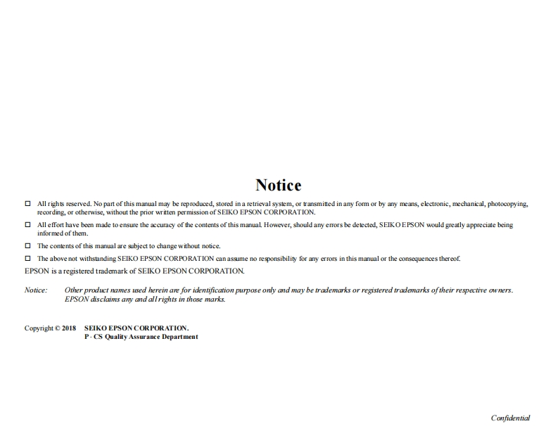 Service ManualColor Inkjet PrinterEPSONET-4750/ET-4760/L6190/ST-4000seriesET-3750/ET-3760/L6170/ST-3000seriesET-3700/ET-3710/L6160 seriesET-2750/ET-2760/L4160/ST-2000seriesET-2700/L4150 seriesEPSONEXCEED YOUR VISIONConfidentialSEMF17-003
