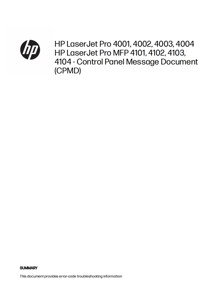 HP LaserJet Pro 4001,4002,4003,4004HP LaserJet Pro MFP 4101,4102,4103,4104Control Panel Message Document(CPMD)2www.hp.com/support/lj4001-4004www.hp.com/support/lj4001-4004pluswww.hp.com/support/limfp4101-4104www.hp.com/support/ljmfp4101-4104plus
