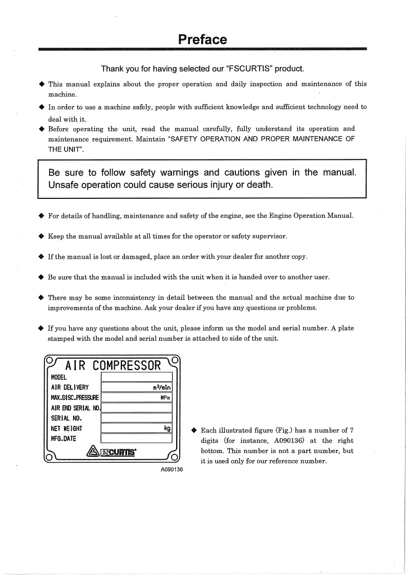 fs_curtis_fac_52p_操作说明书手册_nissan348072@abc12天前发布关注私信1.74MB67页027fs_curtis_fac_52p_操作说明书手册_nissan此内容为付费资源,请付费后查看¥35¥39黄金会员免费钻石会员免费立即购买您当前未登录!建议登陆后购买,可保存购买订单付费资源 第1页 / 共67页 第2页 / 共67页 试读已结束,还剩65页,您可下载完整版后进行离线阅读 THE END工控机电 文本预览 CURTISINSTRUCTION MANUALPORTABLESCREW COMPRESSORFAC-52PPlease be sure to read this manualbefore using this machine. 查看更多 收起部分 喜欢就支持一下吧收藏