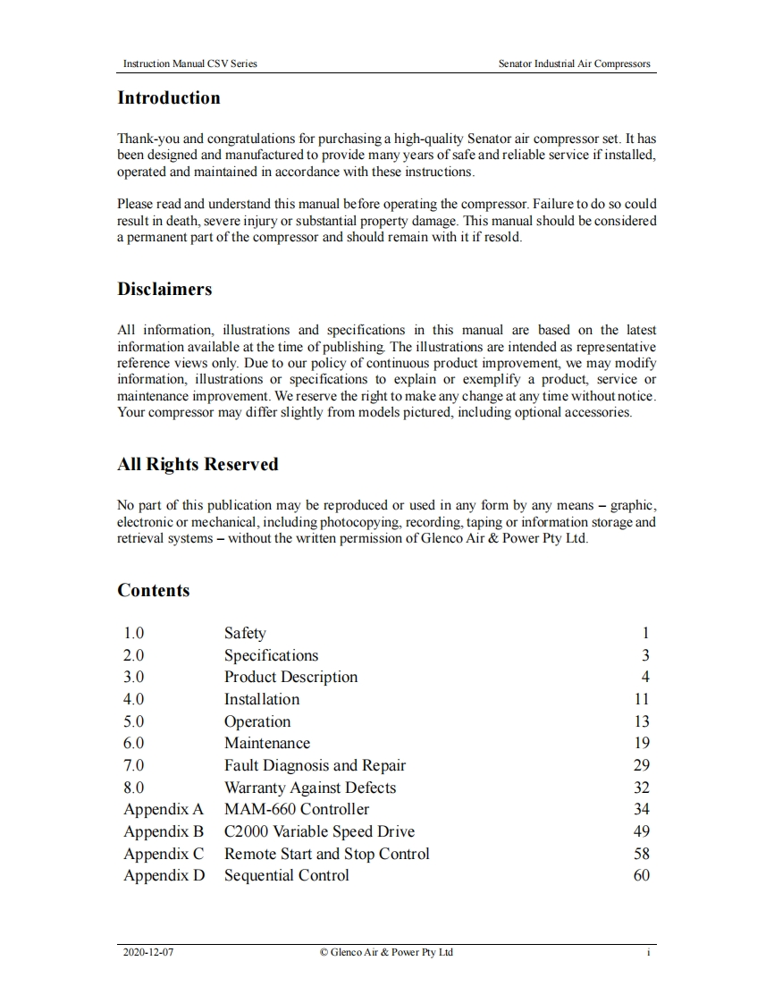 SENATORINDUSTRIAL AIR COMPRESSORSInstruction ManualSenator CSV SeriesAir Compressor Sets withMAM-660 ControllerRevision:2020-12-07GLENCOAir PowerGlenco Air Power Pty Ltd ABN 21101370085 I address 21 Resource Street,Parkinson QLD 4115,Australiaphone 07 33869999 I fax 07 33869988 I email sales@glencomfg.com.au I web www.glencoairpower.com.au