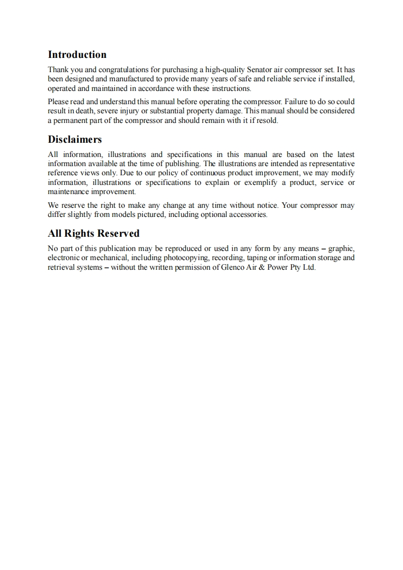 SENATORINDUSTRIAL AIR COMPRESSORSInstruction manual周nSENATOR00Senator DS SeriesAir Compressor Sets withAIMS Controller V2.06Revision:6/06/2025▣∈∩cOAir PowerGlenco Air Power Pty Ltd ABN 21101370085 I address 19 Corymbia Place,Parkinson QLD 4115,Australiaphone 07 3386 9999 I email sales@glencomfg.com.au I web www.glencoairpower.com.au