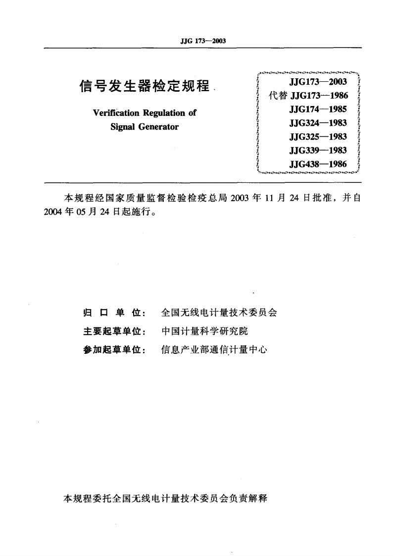 JJG173-2003信号发生器348072@abc4个月前发布关注私信0.52MB27页048JJG173-2003信号发生器此内容为付费资源,请付费后查看¥16¥23黄金会员免费钻石会员免费立即购买您当前未登录!建议登陆后购买,可保存购买订单付费资源 第1页 / 共27页 第2页 / 共27页 试读已结束,还剩25页,您可下载完整版后进行离线阅读 THE END标准规范 文本预览 可订G中华人民共和国国家计量检定规程JJG173-2003信号发生器Signal Generator2003-11-24发布2004-05-24实施国家质量监督检验检疫总局发布 查看更多 收起部分 喜欢就支持一下吧收藏