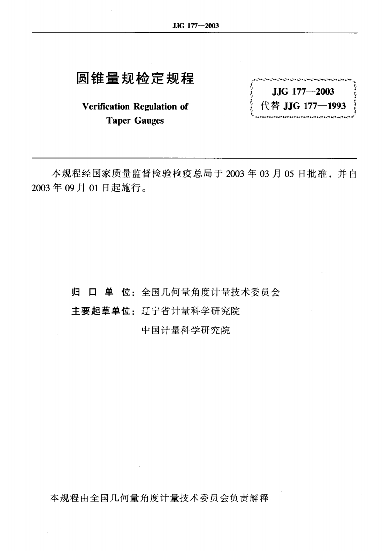 JJG177-2003圆锥量规348072@abc4个月前发布关注私信0.48MB20页041JJG177-2003圆锥量规此内容为付费资源,请付费后查看¥16¥23黄金会员免费钻石会员免费立即购买您当前未登录!建议登陆后购买,可保存购买订单付费资源 第1页 / 共20页 第2页 / 共20页 试读已结束,还剩18页,您可下载完整版后进行离线阅读 THE END标准规范 文本预览 可可G中华人民共和国国家计量检定规程JJG177-2003圆锥量规Taper Gauges2003-03-05发布2003-09-01实施国家质量监督检验检疫总局发布 查看更多 收起部分 喜欢就支持一下吧收藏