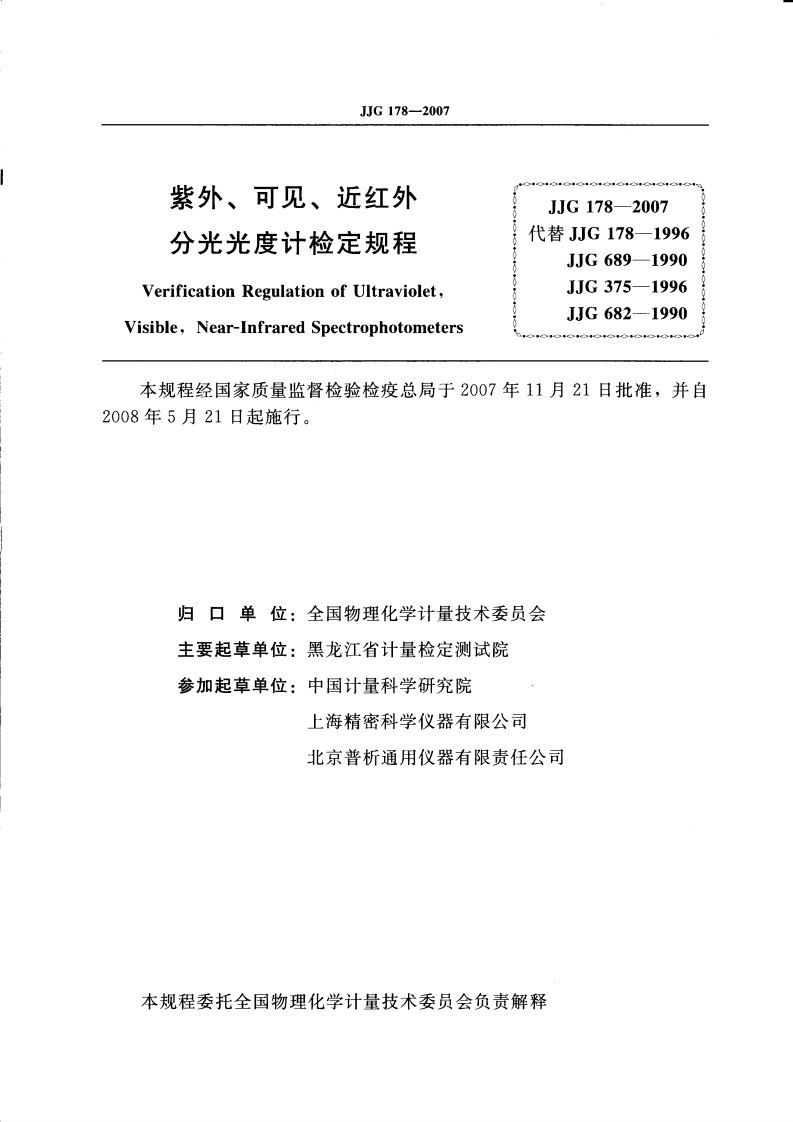 JJG178-2007紫外、可见、近红外分光光度计348072@abc4个月前发布关注私信0.82MB19页046JJG178-2007紫外、可见、近红外分光光度计此内容为付费资源,请付费后查看¥16¥23黄金会员免费钻石会员免费立即购买您当前未登录!建议登陆后购买,可保存购买订单付费资源 第1页 / 共19页 第2页 / 共19页 试读已结束,还剩17页,您可下载完整版后进行离线阅读 THE END标准规范 文本预览 中华人民共和国国家计量检定规程JJG178-2007紫外、可见、近红外分光光度计Ultraviolet,Visible,Near-Infrared Spectrophotometers2007-11-21发布2008-05-21实施国家质量监督检验检疫总局发布 查看更多 收起部分 喜欢就支持一下吧收藏