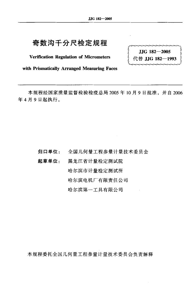 JJG182-2005奇数沟千分尺348072@abc4个月前发布关注私信0.26MB14页023JJG182-2005奇数沟千分尺此内容为付费资源,请付费后查看¥16¥23黄金会员免费钻石会员免费立即购买您当前未登录!建议登陆后购买,可保存购买订单付费资源 第1页 / 共14页 第2页 / 共14页 试读已结束,还剩12页,您可下载完整版后进行离线阅读 THE END标准规范 文本预览 可G中华人民共和国国家计量检定规程JJG182一2005奇数沟千分尺Micrometers with Prismatically Arranged Measuring Faces2005-10-09发布2006-04-09实施国家质量监督检验检疫总局发布 查看更多 收起部分 喜欢就支持一下吧收藏