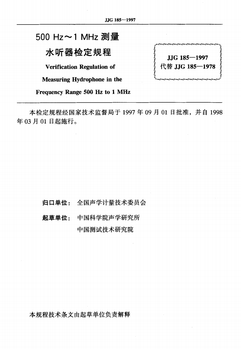JJG185-1997500Hz~1MHz测量水听器348072@abc4个月前发布关注私信0.33MB15页043JJG185-1997500Hz~1MHz测量水听器此内容为付费资源,请付费后查看¥16¥23黄金会员免费钻石会员免费立即购买您当前未登录!建议登陆后购买,可保存购买订单付费资源 第1页 / 共15页 第2页 / 共15页 试读已结束,还剩13页,您可下载完整版后进行离线阅读 THE END标准规范 文本预览 可UG中华人民共和国国家计量检定规程JJG185-1997500Hz~1MHz测量水听器Measuring Hydrophone in the Frequency Range500 Hz to 1 MHz1997-09-01发布1998-03-01实施国家技术监督局发布 查看更多 收起部分 喜欢就支持一下吧收藏