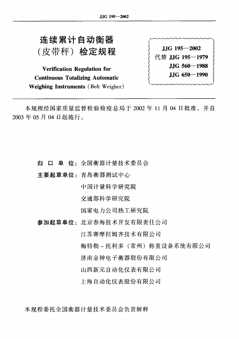 JJG195-2002连续累计自动衡器(皮带秤)348072@abc4个月前发布关注私信3.47MB113页035JJG195-2002连续累计自动衡器(皮带秤)此内容为付费资源,请付费后查看¥16¥23黄金会员免费钻石会员免费立即购买您当前未登录!建议登陆后购买,可保存购买订单付费资源 第1页 / 共113页 第2页 / 共113页 试读已结束,还剩111页,您可下载完整版后进行离线阅读 THE END标准规范 文本预览 可G中华人民共和国国家计量检定规程JJG195-2002连续累计自动衡器(皮带秤)Continuous Totalizing Automatic Weighing Instruments(Belt Weigher)2002-11-04发布2003-05-04实施国家质量监督检验检疫总局发布 查看更多 收起部分 喜欢就支持一下吧收藏