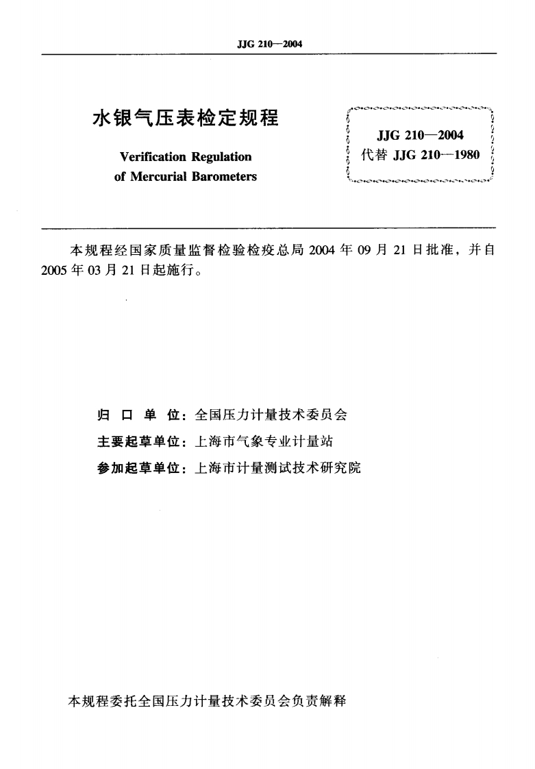 JJG210-2004水银气压表348072@abc4个月前发布关注私信0.38MB16页031JJG210-2004水银气压表此内容为付费资源,请付费后查看¥16¥23黄金会员免费钻石会员免费立即购买您当前未登录!建议登陆后购买,可保存购买订单付费资源 第1页 / 共16页 第2页 / 共16页 试读已结束,还剩14页,您可下载完整版后进行离线阅读 THE END标准规范 文本预览 可而G中华人民共和国国家计量检定规程JJG210一2004水银气压表Mercurial Barometers2004-09-21发布2005-03-21实施国家质量监督检验检疫总局发布 查看更多 收起部分 喜欢就支持一下吧收藏