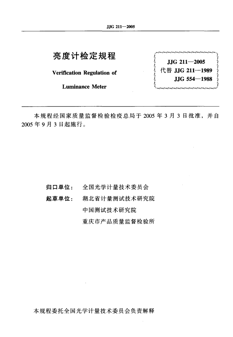 JJG211-2005亮度计348072@abc4个月前发布关注私信0.54MB22页037JJG211-2005亮度计此内容为付费资源,请付费后查看¥16¥23黄金会员免费钻石会员免费立即购买您当前未登录!建议登陆后购买,可保存购买订单付费资源 第1页 / 共22页 第2页 / 共22页 试读已结束,还剩20页,您可下载完整版后进行离线阅读 THE END标准规范 文本预览 可可G中华人民共和国国家计量检定规程JJG211-2005亮度计Luminance Meter2005-03-03发布2005-09-03实施国家质量监督检验检疫总局发布 查看更多 收起部分 喜欢就支持一下吧收藏