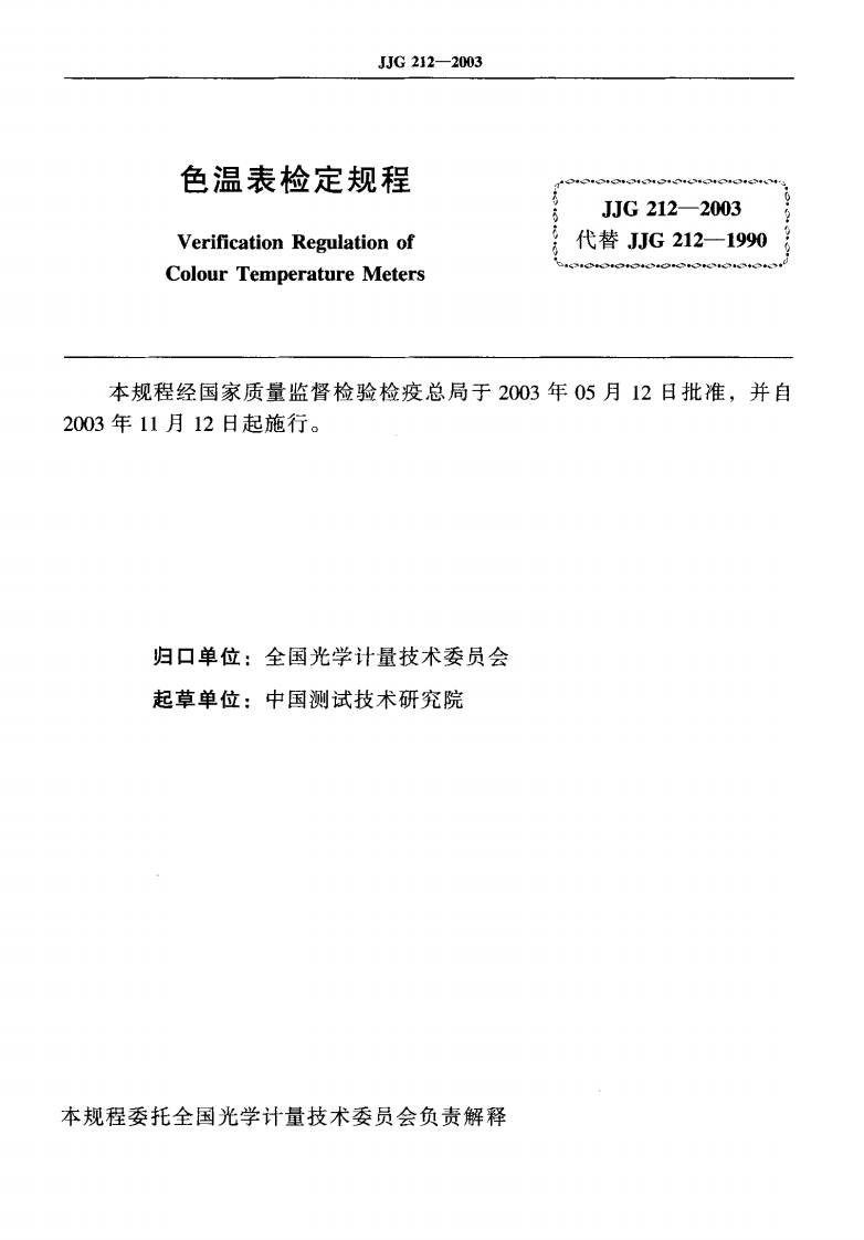 JJG212-2003色温表348072@abc4个月前发布关注私信0.32MB15页025JJG212-2003色温表此内容为付费资源,请付费后查看¥16¥23黄金会员免费钻石会员免费立即购买您当前未登录!建议登陆后购买,可保存购买订单付费资源 第1页 / 共15页 第2页 / 共15页 试读已结束,还剩13页,您可下载完整版后进行离线阅读 THE END标准规范 文本预览 可G中华人民共和国国家计量检定规程JJG212-2003色温表Colour Temperature Meters2003-05-12发布2003-11-12实施国家质量监督检验检疫总局发布 查看更多 收起部分 喜欢就支持一下吧收藏