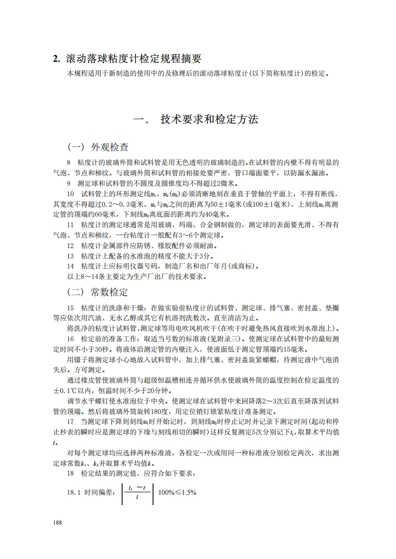 MV_RR_CNG_0045滚动落球粘度计检定方法1.滚动落球粘度计检定规程说明编号JJG214-1980名称(中文)滚动落球粘度计检定规程(Verification Regulation of Viscosimeter for Roll-Down ball Type归口单位中国计量科学研究院起草单位中国计量科学研究院浙江省标准计量局主要起草人袁和林方国铭批准日期1980年8月22日实施日期1981年3月1日替代规程号适用范围本规程适用于新制造、使用中和修理后的滚动落球粘度计(以下简称粘度计)的检定。主要技术1粘度计的玻璃外筒和试料管是用无色透明的玻璃制造的。在试料管要求的内壁不得有明显的气泡、节点和柳纹,与玻璃外筒和试料管的相接处要严密,管口端面要平,以防漏水漏油。2.测定球和试料管的不圆度及圆锥度均不得超过2微米3.试料管上的环形测定线必须清晰地刻在垂直于管轴的平面上,不得有断线。4粘度计的测定球通常是用玻璃、玛瑙、合金钢制作的,测定球的表面要光滑、不得有气泡、节点和柳纹,一台粘度计一般配有36个测定球。5粘度计金属部件应防锈、橡胶配件必须耐油。6.粘度计上配备的水准泡的精度不能大于3分。7粘度计上应标明仪器号码,制造厂名和出厂年月。是否分级是口,分为级:否口检定周期(年)附录数目出版单位中国计量出版社检定用标准物质相关技术文件备注附录(本附录仅为技术文件的摘要,如需全文,请与出版发行单位联系)187