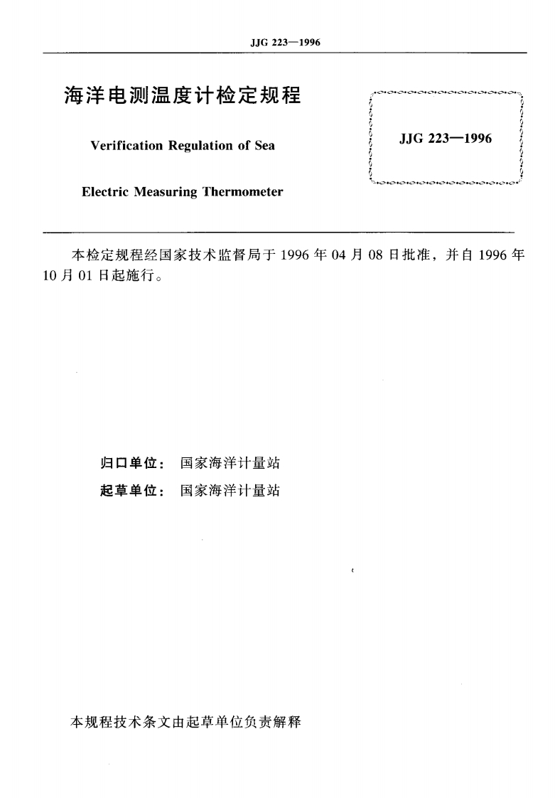 JJG223-1996海洋电测温度计348072@abc4个月前发布关注私信0.15MB9页021JJG223-1996海洋电测温度计此内容为付费资源,请付费后查看¥16¥23黄金会员免费钻石会员免费立即购买您当前未登录!建议登陆后购买,可保存购买订单付费资源 第1页 / 共9页 第2页 / 共9页 试读已结束,还剩7页,您可下载完整版后进行离线阅读 THE END标准规范 文本预览 可可G中华人民共和国国家计量检定规程JJG223-1996海洋电测温度计Sea Electric Measuring Thermometer1996-04-08发布1996一10-01实施国家技术监督局发布 查看更多 收起部分 喜欢就支持一下吧收藏
