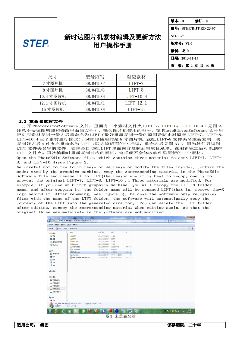 版本:B修订:0猜号:STEP/R-JTRD-23-07新时达图片机素材编辑及更新方法N0.-9STEP用户操作手册版本号:V1.0编制:龙山日期:2013-11-15页戴:第1页共15页1.工具电脑U盘PhotoEditorSoftware压缩包Compressionpackage(款件包,包含lift client..exe)2.图片编辑方法步骤Image editing method steps:2.l准备工作preparatory work(1)解压PhotoEditorSoftware压缩包到电脑,注意不要试图解压到含中文的目录,或者把解压之后把PhotoEditorSoftware的文件名改为含中文的名字(1)Unpack the PhotoEdit Software compression package to the computer,take care not to test thediagram to press the directory containing Chinese,or decompress it afterPhotoEdit Software changed the file name to chinese(2)本系统能容纳的图片数量大,最多能存储64张背景图片,这也就是说可以写入图片张数多达64张,同时待更新的图片格式任意(即:bmp,jPg,png,tiff,gif等都可以)。但是如果要更新7寸TFT背景素材,那么选择的图片的尺寸应该大于800*480:如果要更新8寸或者是10.4寸的T℉T背景素材,那么选择的图片的尺寸应该大于800*600。(2)The system can accommodate a large number of pictures,up to 64 background pictures,whichmeans that up to 64 picture sheets can be written,the sameThe image format to be updated is arbitrary(ie BMP,JPG,PNG,TIFF,GIF,etc.)However,if youwant to update the 7-inch TFT background material,the size of the selected picture should begreater than 800 480;If you want to update 8 inches or 10.4 inches of TFT background material,the size of the selected image should be greater than 800 600.(3)把要编辑的广告背景图片放在一个文件里,如下图,把需要编辑的三个广告图片放在F:poto下(3)Place the background picture of the advertisement to be edited in a file.As shown inthe figure below,place the three advertising images to be edited under F:photo图1(4)确认您使用的图片机型号,确认图片机是横显还是竖显(如果您不确认横竖显示情况,请查看图片机上的拨码开关SW1.4,如果SW1,4为ON就是横显,是OF℉为竖显)。下表是我司图片机型号(4)Verify the type of picture machine you are using,and confirm whether thegraphics machine is across or vertical(if you do not confirm the horizontal display,pleaseCheck the dial switch SW 1.4 on the picture machine.If SW 1,4 is ON,it is OFF isvertical).The following table shows the model of our drawing machine适用公司:集团保存期限:二十年