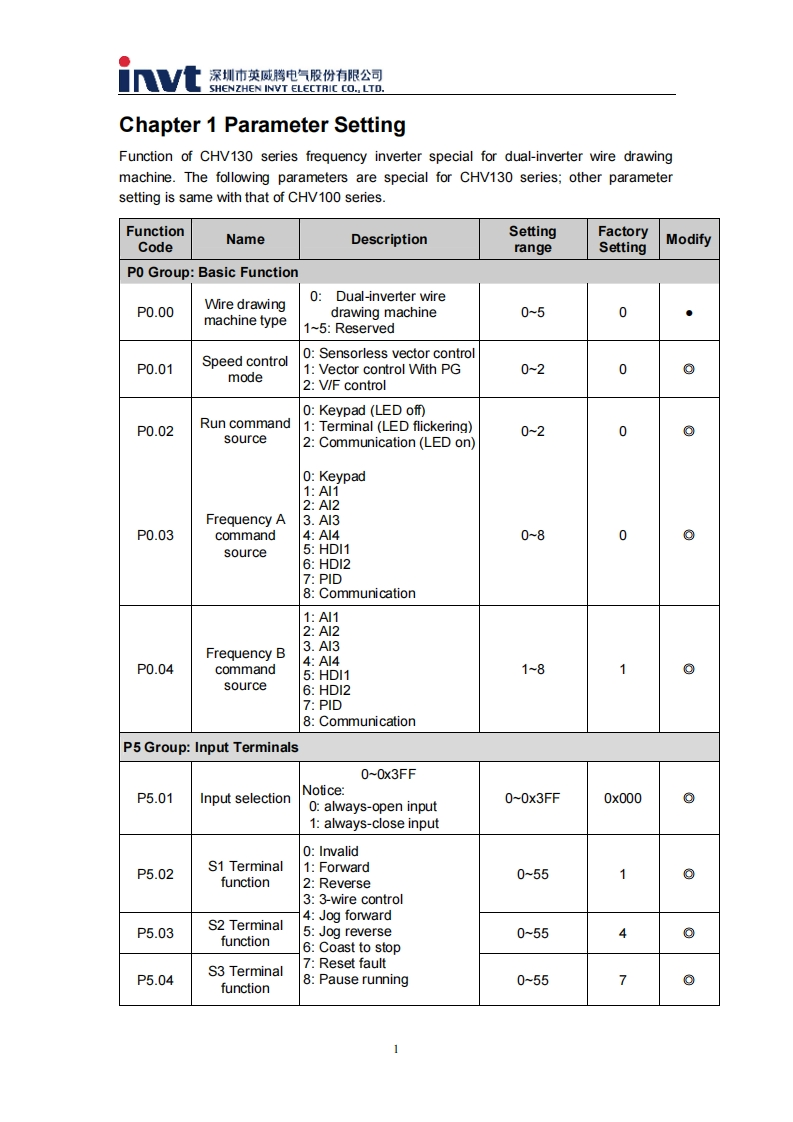 Dual-inverter Wire Drawing MachineCHV130 series Frequency inverterOperation manualinvt00Notice:Please use this manual together with "CHV Series Close LoopVector Control Inverter Operation manual".SHENZHEN INVT ELECTRIC CO.,LTD.