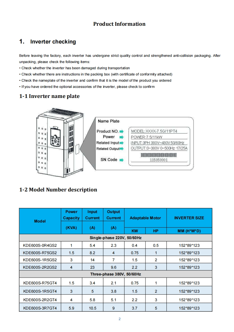 High performance general purpose AC drive user manualSafety Precautions"Warning Indicates that if you do not follow the regulations it may result in death or serious bodily injuryWarningDanger"Indicates that if you do not follow the regulations it will result in death or serious bodily injuryDangerSecurity statement1)When installing.operaing,and maintaining the product,please read and follow these safety precautions first.2)In order to ensure the safety of people and equipment,please follow all safety precautions described on the product and in the manual when installing.operating and maintaining the product.3)The "Caution","Warning"and "Danger"items in the manual do not represent all the safety items that should be followed,but only as a supplement toall the safety precautions.4)This product should be used in an emvironment that meets the design specifications,otherwise it may cause malfunctions,and malfunctions orcomponent damage caused by non-compliance with relevant regulations are not within the scope of product quality assurance.5)Our company will not bear amy legal res ponsibility for personal safety accidents and property losses caused by illegal operation of the product.1.PurposeThis series is suitable for controlling the variable speed operation of three-phase AC motors,and cannot be used forDangersingle-phase motors or other purposes,otherwise it may cause inverter failure or fire.This series of inverters cannot be simply applied to occasions directly related to personal safety,such as medical devices.2.Goods InspectionWhen unpacking,it is found that the product and its accessories are damaged,rusted,signs of use,etc.,please do notWaminginstall!When unpacking,if water is found inside the product,parts missing,or parts damaged,please don't ins tall it!Please check the packing list,ifyou find that the packing list does not match the product name,please do not install it!3.Safe operationIt is strictly forbidden for non-professionals to install,connect,maintain,inspect or replace parts of the product!The installation,wiring.maintenance,inspection or component replacement of this product can only be carried out byAprofessionals who have received relevant training in electrical equipment and have sufficient electrical knowledge.WarningThe installer must be familiar with the product ins tallation requirements and related technical information.When it is necessary to install equipment with strong electromagnetic interference such as a transformer,please install ashielding protection device to avoid malfunction of this product!4.Operation and maintenanceWhen the function of automatic fault reset or restart after power failure is set,safety isolation measures should be taken forthe mechanical equipment,otherwise it may cause equipment damage and personal safety accidents.After the inverter is connected to the power supply,even if it is in the stop state,the erminals of the inverter are still live andDangercannot be touched,otherwise there is a d