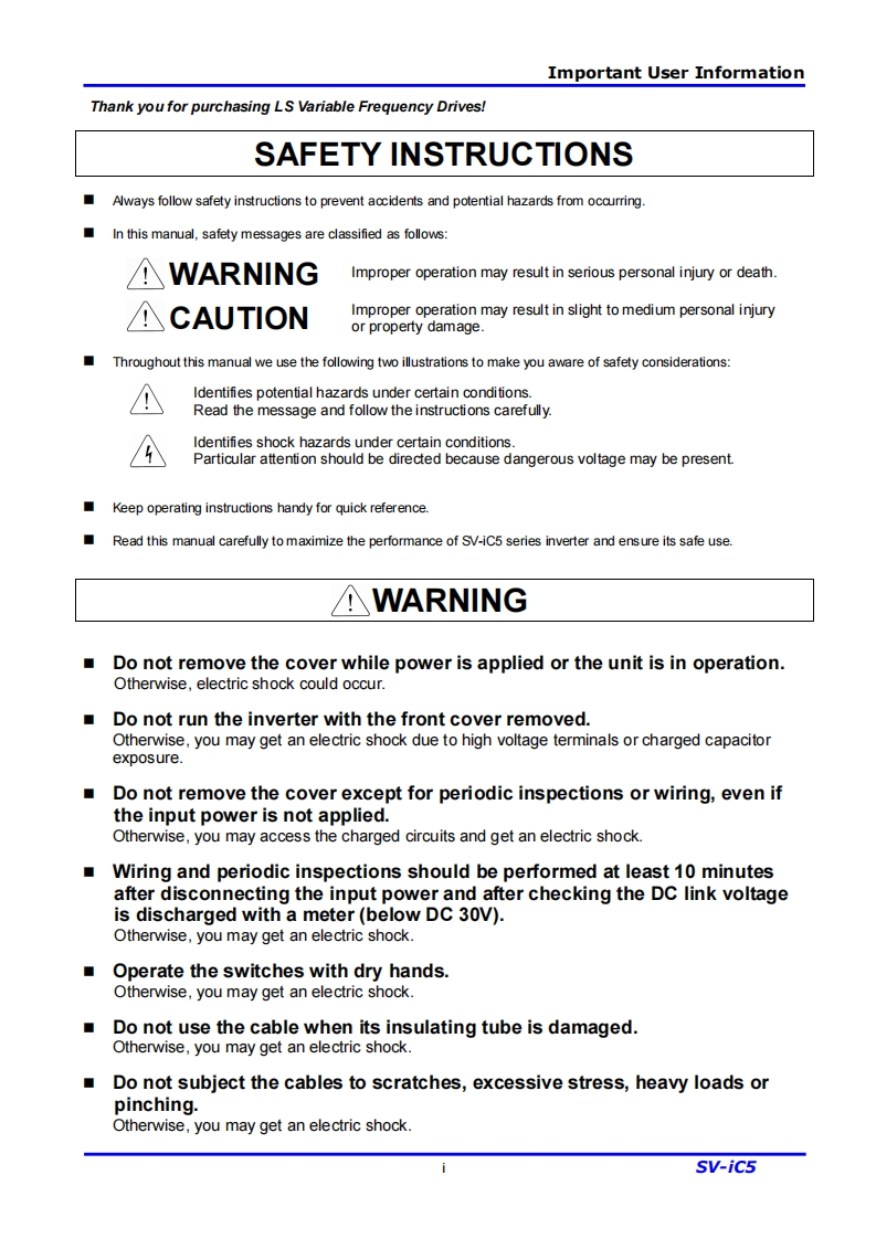 solution Leader in Electrics&AutomationUser ManualSV-iC5AC Drives0.4-2.2kW[200]△Safety InstructionsRead this manual carefully before Installingwiring,operating,servicing or inspectingthe drive.Keep this manual within easy reach for南市quick reference.Industrial Systemswww.lsis.biz