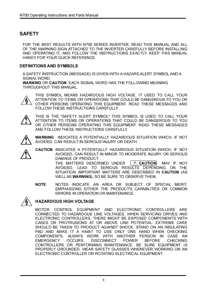 N700 Operating Instructions and Parts ManualCAUTION FOR UL/CUL REQUIREMENTSTHE HYUNDAI HEAVY INDUSTRY N700 INVERTER UL FILE NUMBER IS E205705.CONFIRMATION OF UL LISTING CAN BE FOUND ON THE UL WEBSITE:W.UL.COMDO NOT CONNECT OR DISCONNECT WIRING,OR PERFORM SIGNAL CHECKSWHILE THE POWER SUPPLY IS TURNED ON.THERE ARE LIVE PARTS INSIDE THE INVERTER.NEVER TOUCH THE PRINTEDWIRING BOARD(PWB)WHILE THE POWER SUPPLIES TURNED ON.[WARNING]THE BUS CAPACITOR DISCHARGE TIME IS 5MINUTES.BEFORESTARTING WIRING OR INSPECTION,SWITCH POWER OFF,WAIT FOR MORE THAN5 MINUTES,AND CHECK FOR RESIDUAL VOLTAGE BETWEEN TERMINAL P(+)ANDN(-)WITH A METER ETC.,TO AVOID HAZARD OF ELECTRICAL SHOCK.[SHORT CIRCUIT RATING]THIS INVERTER IS NOT SUITABLE FOR USE ON ACIRCUIT CAPABLE OF DELIVERING MORE THAN 5,000RMS SYMMETRICALAMPERES,480 VOLTS AND 240 VOLTS MAXIMUM.[OVER SPEED PROTECTION]THIS INVERTER DOES NOT PROVIDE OVER SPEEDPROTECTION.[OVER LOAD PROTECTION]THIS INVERTER PROVIDES MOTOR OVER LOADPROTECTION.OVER LOAD PROTECTION LEVEL IS 50~200%OF FULL LOAD CURRENT.THEPROTECTION LEVEL IS 50~200%OF FULL LOAD CURRENT.THE PROTECTIONLEVEL MAY BE ADJUSTED BY CODE B031.REFER TO THE N700 USER GUIDE OR CATALOGUE.[ENVIRONMENT]MAX.SURROUNDINGAIR TEMPERATURE50℃(5.5-55kW0AMBIENT HUMIDITY90%RH OR LESS(NO CONDENSING)STORAGETEMPERATURE-20~60℃VIBRATION5.9$(0.6G)(5.5-22kW)/2.94$(0.3G)(30~132k)ALTITUDEALTITUDE 1000M OR LESSINDOORS (NO CORROSIVE AND FLAMMABLE GASES,OILAMBIENCEMIST,DUST AND DIRT)POLLUTION DEGREE5.5~55KW POLLUTION DEGREE 2