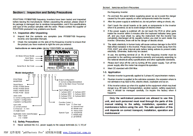 ForewordCONTENTSThank you very much for purchasing Pl7800.PI7600 Family FrequencySection LInspection and Safety Precautions......................1Imverters.This family is designed based on the experience ofPOWTRAN Company in the professional manufacture and sale of theSection ll.Installation Standby Circuit.................3products,and suitable for general-purpose machine,fan/pump drive,high frequency drive and heavy load machine.Section Ill.Operafing keyboard.....14This User's Manual provides the users with the instructions on theinstallation,parameter setfing,fault diagnosis,routine maintenance andSection I.Test running.…19necessary precautions.Please read the Manual carefully before theinstallation of the product in order to ensure that it can be correctlySection V.Funcfon parametr table......21installed and operated.This User's Manual includes PI7800.Pl7600,the general purposeSecion VL.Funcfion Parameter Description.34control and special purpose control.The general purpose control haF,G ,M and H;The special purpose control has S,T and Z:Section Vll.Fault Diagnosis and Solufons........................88F:FLOW LOADG:GENERAL LOADSection VIIL.Standard Specificafions.....90M:MEIDDLE LOADH:HEAVY LOAD.Section [X.Maintenance...........103S:TEXDRIE.Section X.105T:WINDLASS.Z:JETDRNE.Appendix 1.PI7000 RS485 communication protocol..............109Please contact the local dealers or directly contact our company.Appendix 2.PG Instrucfon..........120Please keep this user's manual in good condifion,for it will be helpful tothe repair,maintenance,and applications in the future.Appendix 3.Converter water supply controller instrucfon........123For information about other product,please visit our website:http://ww.powtran.com.PDF文件使用"pdfFactory Pro”试用版本创建画,fineprint.com,cn