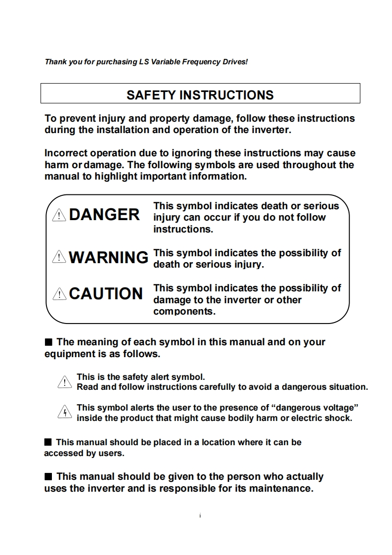Right choice for ultimate yieldLSIS strives to maximize customers'profit in gratitude of choosing us for yourpartner.SV-iP5A User Manual5.5-30kW[200V]/2.2-450kW[400V]LS0Safety InstructionsRead this manual carefully beforeinstalling,wiring,operating,servicingor inspecting this equipment..Keep this manual within easy reachIndustrial Systemsfor quick reference.