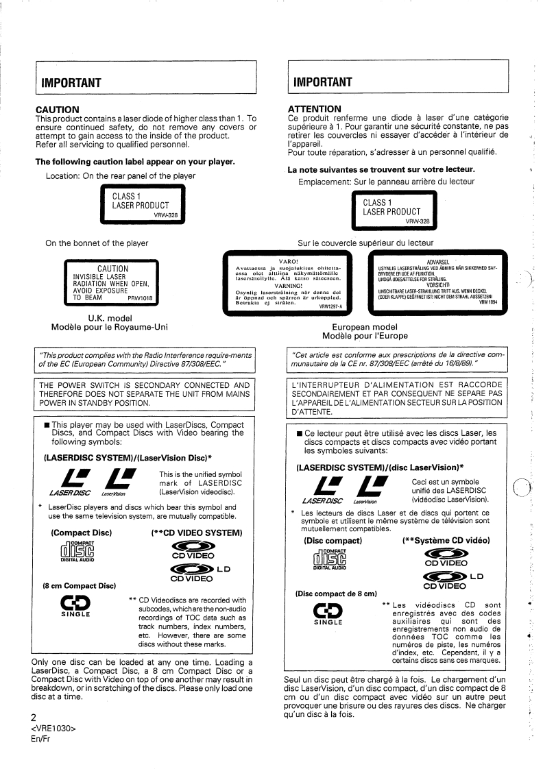 LaserDiscPIONEEROperating InstructionsThe Art of EntertainmentMode d'emploiBedienungsanleitungIstruzioni per I'usoCLD-160KPAL/NTSCEnglishCD CDV LD PLAYERLECTEUR DE CD CDV LDCD/CDV/LD-SPIELERFrancaisLETTORE PER CD,CDV E LDDeutsch当可▣d8Italianoδd5前DIGITAL AUDIOLASERDISCIMPORTANTCAUTIONThelightning flashwith arrowhead.withinan equilateralCAUTION:triangle,is intended to alort the user to the presence ofTO PREVENT THE RISK OF ELECTRIC SHOCK,DO NOTTheuninsulated 'dangerous voltage'within the product'sREMOVE COVER (OR BACKI.NO USER-SERVICEABLEthe preenclosure that may be of sufficient magnitude toPARTS INSIDE.REFER SERVICING TO QUALIFIEDoperatng and mconstitute a risk of electric shock to persons.SERVICE PERSONNELerature accompanying the appliance.IMPORTANT13Do not connect either wire to the earth terminal of athree pin plug.shock.Thethedibution panel shouldbeFOR USE IN THE UNITEDproNOTEKINGDOMmains lead of this appliance maynotcorrespand with colouredAfter replacing or changing a fuse,the fuse cover in themarkings identifying the terminals in your plug.proceed asplug must be replaced with a fuse cover which corre-The wires in this mains lead are coloured insponds to the colour of the insert in the base of the plugnccordance with the followiThe wire which is coloured blue must be connected to theor the word thatis embossed on the base of the plug.andblueterminal which is marked with the letter N or coloured black.the apol ance must not be used without 8 fuse covbrownThe wire which is coloured brown must be connectedlost.replacement fuse covers can be obtained from yourto the terminal which is marked with the letter Lor colouredthe plg must be cut o andred.This appliance is rated at 13 arOnlympSOnly 13