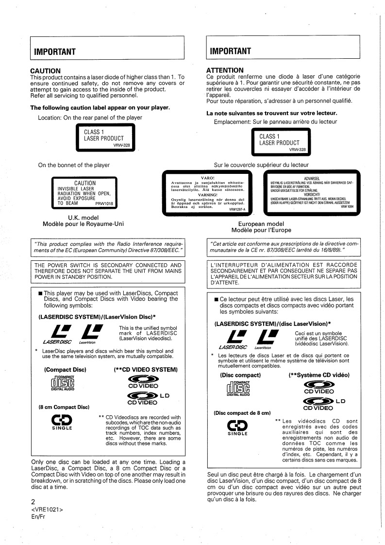 LaserDiscPIONEEROperating InstructionsThe Art of EntertainmentMode d'emploiBedienungsanleitungIstruzioni per I'usoCLD-2950PAL/NTSCEnglishCD CDV LD PLAYERLECTEUR DE CD CDV LDCD/CDV/LD-SPIELERFrancaisLETTORE PER CD,CDV E LDDeutschewe百go0Italiano高6通日d宽DIGITAL AUDIOLASERDISCIMPORTANTCAUTIONRISK ONOTOPEHOCKThelightning flash with arrowhead.within anequilateralCAUTION:triangle,is intended to alert the user to the presence ofTO PREVENT THE RISK OF ELECTRIC SHOCK DO NOTThe point within an equlateral triangle isuninsulated 'dangerous voltage'within the product'sREMOVE COVERIOR BACKI NOUSER-SERVICEABLEintended to afert the user to the presence of importantenclosure that may be of sufficient magnitude toPARTS INSIDE.REFER SERVICING TO QUALIFIEDaperating and maintenance (servicingl instructions in theconstitute a risk of electric shock to persons.SERVICE PERSONNEL.terature accomparying the appliance.IMPORTANTThe cut-off plug should be disposed of and must not beDo not connect either wire to the earth terminal of ainserted into ary 13 amp socket as this can result in electricthree pin plug.shock.The plug or adeptor or the distribution panel shouldFOR USE IN THE UNITEDbe provided with 5 amp fuse.As the colours of the wires inNOTEthe mains lead of this appliance may not correspond withKINGDOMcoloured markings identifying the temmina's in your plugreplecing or changin the fusri thewith a fuse cover which corre-The wires in this mains lead are coloured inThe wire which is coloured blue must be connected to thesponds to the colour of the insert in the base of the plugaccordance with the following codeor the woed thatis embossed on the base of the plug.andBlueNeutralthe applance must not be used without a fuse cover.IfBrownLivered bwn must be connectedlost replacement fuse covers can be obtained from:If the plug provided is unsuitable for your socketcanC0的o1 p3%EU4 Meue04】your dealer.outlets.the plug must be cut aff and a suitable plugOnly 5 A fuses approved by B.S.I.or A.S.TA to B.S.fitted.1362 shoud be used.