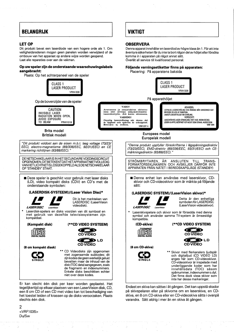 LaserDisc.PIONEERGebruiksaanwijzingThe Art of EntertainmentBruksanvisningManual de instruccionesManual de instrucoesCLD-D515PAL/NTSCCD/CDV/LD-SPELERCD/CDV/LD-SPELAREREPRODUCTOR DE CD,CDV Y LDREPRODUTOR DE CD,CDV E LDCLD-Dots囊Nederlandsd5爸DIGITAL AUDIOLASERDISCSevenkaEspafolPortuguesIMPORTANTCAUTIONRISK OF ELECTRIC SHOCKDO NOT OPENThelightning flashwith arrowhead,within anequilatCAUTION:The exclamation point within an equtateral triangle isthe presence ofTO PREVENT THE RISK OF ELECTRIC SHOCK,DO NOTintended to alert the user to the presence of importantthin the proaREMOVE COVER (OR BACK).NO USER-SERVICEABLEoperating and meintenance(servicing)instructions in thentm9nudePARTS INSIDE.REFER SERVICING TO QUALIFIEDliterature accompanying the applance.nstitute a risk of electrie shock to persons.SERVICE PERSONNEL.