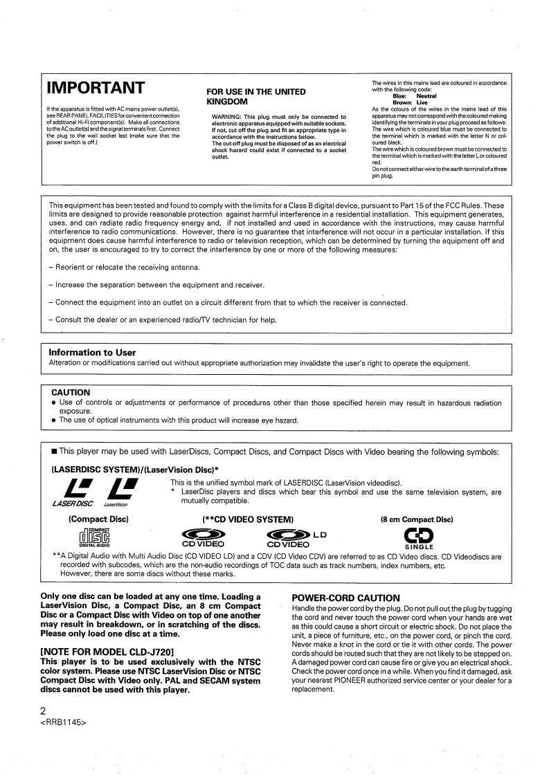 CD CDV LD PLAYERLaserDiscOperatingInstructionsCLD-J720NTSC]ds前COMPACTCLD-1420PAL/NTSCDIGITAL AUDIOLASERDISCThis player does not apply to business use,and CD-ROM/CD graphic discs cannot be played with this player.▣画666The illustration shows CLD-J720.Thank you for buying this Pioneer product.LINE VOLTAGE SELECTOR SWITCHPlease read through these operating instructions so youwill know how to operate your model properly.After youOnly multi-voltage models are provided with this switch.have finished reading the instructions,put them away in aU.K.model is not provided with this switch.safe place for future referenceMains voltages in Saudi Arabia are 127V and 220V onlyIn some countries or regions,the shape of the power plugNever use this model with a 110V setting in SaudiArabia.and power outlet may sometimes differ from that shown inthe explanatory drawings.However,the method ofThe line voltage selector switch is located on the rear panelconnecting and operating the unit is the same.of this player.Before your player is shipped from the factory,the switch is set to the power requirements of the player'sWARNING:TO PREVENT FIRE OR SHOCK HAZARD.destination.Check that it is set properly before pluggingthe power cord into the outlet.If the voltage is not properlyDO NOT EXPOSE THIS APPLIANCE TO RAIN ORset or if you move to an area where the voltage requirementsMOISTURE.differ,adjust the selector switch as follows:1.Use a medium-sized (flat blade)screwdriver.THE POWER SWITCH IS SECONDARY CONNECTED AND2.Insert the tip of the screwdriver into the groove of theTHEREFORE DOES NOT SEPARATE THE UNIT FROM MAINSselector switch and turn it to set the player to the powerPOWER IN STANDBY POSITION.voltage of your area"This product complies with the Radio Interference require-ments of the EC (European Community)Directive 87/308/EEC.CAUTION:This product satisfies FCC regulations whenshielded cables and connectors are used to connect the unitVOLTAGEto other equipment.To prevent electromagnetic interferenceSELECTORwith electric appliances such as radios and televisions,useSet the selector so that arrow(Figure shows arrowshielded cables and connectors for connections.points to power voltage of yourpointing to 230 volts.)area (Figure shows arrow pointingto 110 volts.)IMPORTANTCAUTIONRISK OF ELECTRIC SHOCKDO NOT OPENThe lightning flashwith arrowhead,within anequilateraCAUTION:triangle.is intended to alert the user to the presence ofThe exclamation point within triangle isuninsulsted 'dangorous voltage"within the product'sREMOVE COVER (OR BACK)intended to alert the user to the presence of importantenclosure that may be of sufficient magnitude toPARTS INSDEoperating and maintenance (servicinglinstructions in theconstitute a risk of electric shock to persoREFER SERVICING TO QUALFIEDSERVICE PERSONNELliterature accomparrying the appliance.②PIONEERThe Art of Entertainment