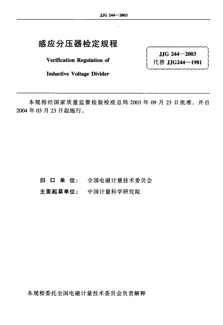 JJG244-2003感应分压器348072@abc4个月前发布关注私信0.58MB26页026JJG244-2003感应分压器此内容为付费资源,请付费后查看¥16¥23黄金会员免费钻石会员免费立即购买您当前未登录!建议登陆后购买,可保存购买订单付费资源 第1页 / 共26页 第2页 / 共26页 试读已结束,还剩24页,您可下载完整版后进行离线阅读 THE END标准规范 文本预览 可G中华人民共和国国家计量检定规程JJG244一2003感应分压器Inductive Voltage Divider2003-09-23发布2004-03-23实施国家质量监督检验检疫总局发布 查看更多 收起部分 喜欢就支持一下吧收藏