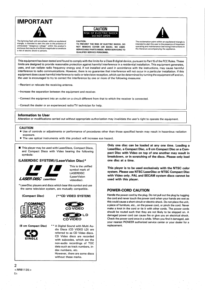 OperatingCD CDV LD PLAYERInstructions。LD-J91Od写前COMPACTLaserDiscDIGITAL AUDIOLASER DISCNTSC.This player does not apply to buisiness use,and CD-ROM/CDgraphic discs cannot be played with this player.暖Thank you for buying this Pioneer product.VOLTAGE SELECTOR SWITCHPlease read through these operating instructions so you willMains voltages in Saudi Arabia are 127V and 220V only.Neverknow how to operate your model properly.After you haveuse this model with a 110V setting in Saudi Arabia.finished reading the instructions,put them away in a safeThe line voltage selector switch is on the rear panel.Before yourplace for future reference.model is shipped from the factory,this switch is set to the powerIn some countries or regions,the shape of the power plugrequirements of the destination.Check that it is set properly be-fore plugging the power cord into the household wall socket.If theand power outlet may sometimes differ from that shownvoltage is not properly set or if you move to an area where the vol-in the explanatory drawings.However,the method of con-tage reauirements differ.adiust the selector switch as follows.necting and operating the unit is the same.1.Use a medium-size screwdriver.2.Insert a screwdriver in the groove of the voltage selector,andadjust so that the tip of the groove points to the voltageWARNING:TO PREVENT FIRE OR SHOCK HAZ-value of your area.ARD,DO NOT EXPOSE THIS APPLIANCE TO RAIN ORMOISTURE.plug model>THEREFORE DOES NOT SEPARATE THE UNIT FROM MAINSPOWER IN STANDBY POSITION."This product complies with the Radio Interference requirements of the EC (European Community)Directive 87/308/EEC."88Set the selector so that(Figure shows arrowCAUTION:Be sure to use the shielded cables when connect thisarrow points to powerpointing to 230 volts.)equipment to other devices.voltage of your area(Figure shows arrowpointing to 110 volts.)PIONEERThe Art of Entertainment