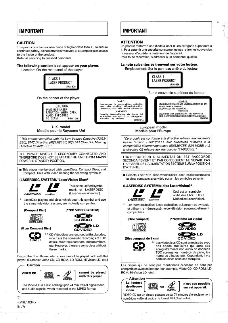 LaserDisc.PIONEEROperating InstructionsThe Art of EntertainmentMode d'emploiBedienungsanleitungIstruzioni per I'usoCLD-S310PALEnglishCD CDV LD PLAYERLECTEUR DE CD CDV LDCD/CDV/LD-SPIELERFrancaisLETTORE PER CD,CDV E LDDeutschCLD-SKOItalianodiscDIGITAL AUDIOLASERDISCIMPORTANTCAUTIONRISK DO NOOPENOCKThelightning fiash with arrowhead,withinan equilateralCAUTION:The exclamation point within an equlateral triangle istriangle,is intended to alert the user to the presence ofTO PREVENT THE RISK OF ELECTRIC SHOCK,DO NOTuninsulated 'dangerous voltage"within the product'sREMOVECOVER(ORBACK).NO USER-SERVICEABLEoperating and maintenance (senenclosure that may be of sufficient magnitude toPARTS INSIDE.REFER SERVICING TO QUALIFIEDconstitute a risk of electric shock to persons.SERVICE PERSONNELIMPORTANTThe cut-off plug should be disposed of and must not beDo not connect either wire to the earth terminal of ainserted into ary 13 amp socket as this can result in electriethree pin plug.shock.The plug or adaptor or the distribution penel shoutdFOR USE IN THE UNITEDbe provided with 5 amp fuse.As the colours of the wires inNOTEthe mains lead of this appliance may not correspond withAfter replacing or changing a fuse,the fuse cover in theKINGDOMcoloured markings identifying the terminals in your plug.plug must be replaced with a fuseover which correThe wires in this mains lead are coloured inoroceed as lolows:ods to the colour of the insert in the hase of theaccordance with the following codeThe wire which is coloured blue must be connected to theor the wBlueNeutralterminal which is marked with the letter N or coloured blackapplance must not be usedBrownLiveThe wire which is coloured brocement fuse oovers can beobtained from:f the plug provided is unsuitable for your socketto the termoutlets,the plug must be cut off and a suitable plugred5A fuses approved by B.S.L or A.S.TA to B.Sfitted.1362 shoud be used