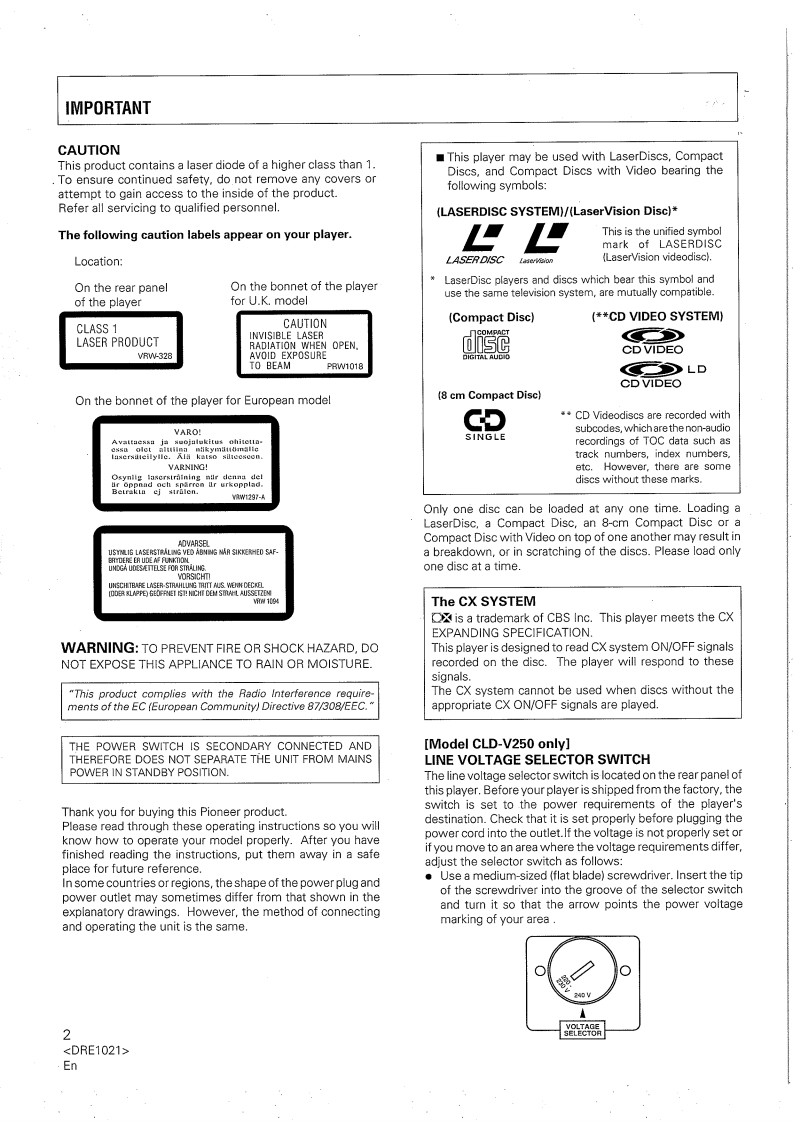PIONEERLaserDisc.The Art of EntertainmentOperating InstructionsMode d'emploiLaserKarackeNTSC/PALBedienungsanleitungIstruzioni per I'uso.CD-ROM/CD graphic discs cannot be played with thisplayer..Ce lecteur ne lit pas les disques graphiques CD-ROM etCLD-V250CD..CD-ROMs/Grafik-CDs konnen nicht auf diesem Spielerverwendet werden.CD CDV LD PLAYER.CD-ROM/CD di grafica non possono essere riprodotti conquesto lettore.LECTEUR DE CD CDV LDCD/CDV/LD-SPIELER[Model CLD-V250only】LETTORE PER CD,CDV E LDSet the line voltage selector switch to thepower voltage of your area before connectingEnglishthe power cord.(Refer to page 2.)[Modele CLD-V250 uniquement]Avantde raccorderle cordon d'alimentation,regler le selecteur de tension sur la valeurcorrespondant au secteur local.(Voir page22.1Francais[nur Modell CLD-V250]Wehisehaltervoes88Netzkabels auf die ortliche NetzspannungDeutschein.(Siehe Seite 42.)白w当尚向✉一一白兰[Solo modello CLD-V250]Regolare il selettore del voltaggio sullatensione in uso nel paese in cui viveteItaliano.The above illustration shows model CLD-V300.Consultare in proposito pag.62.Le modele represente sur I'illustration est un CLD-V300..Die obige Abbildung zeigt das Modell CLD-V300..L'illustrazione in alto mostra il modello CLD-V300.dDIGITAL AUDIOLASER DISCIMPORTANT 1CAUTIONRISK OF ELECTRIC SHOCKDO NOT OPENCAUTION:uniosulated 'daraernue vohaeTO PREVENT THE RISK OF ELECTRIC SHOCK,DO NOTThe exclamation point within an equilateral triangle isintended to aleREMOVE COVER(ORBACKI.NOUSER-SERVICEABLEthe preconstitute a risk of electric shock to personsPARTS INSIDE.REFER SERVICING TO QUALIFIEDSERVICE PERSONNEL.accomparying the appliance.IMPORTANT 2The wire which is coloured blue must be connected toFOR USE IN THE UNITEDthe temminal which is marked with the letter N or colKINGDOMoured black.85ComoThe wire which is coloured bronected tothe terminalwhich is marked withof additional Hi-Fi componentisl.Make all connred.tionstothe ACoutletis)and the signalterminals first.Coeorheatnhe6ibtng26secolourednthe plug to the wall socket lsst (make sure thet theBlue:Neutrallugpower switch is off.!Brown:UiveAs the colours af the wires in the mains lead of thisent sold in the U.K.is not supplied with apowerplug.