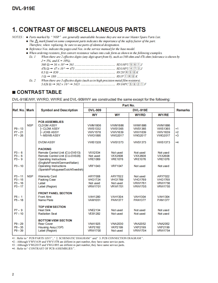 PioneerServiceManualORDER NO.RRV2095DVD LD PLAYERDVL-919ERefer to the service manual RRV1888 for DVL-909/WY.THIS MANUAL IS APPLICABLE TO THE FOLLOWING MODEL(S)AND TYPE(S).ModelTypePower RequirementRegion No.RemarksDVL-919EWY0AC220-240WWY/RD0AC220-240VWYIRE0AC220-240VCONTENTS1.CONTRAST OF MISCELLANEOUS PARTS.....22.SCHEMATIC DIAGRAM.63.PCB CONNECTION DIAGRAM…8PIONEER ELECTRONIC CORPORATION 4-1,Meguro 1-Chome,Meguro-ku,Tokyo 153-8654.JapanPIONEER ELECTRONICS SERVICE,INC.P.O.Box 1760,Long Beach,CA90801-1760,U.S.A.PIONEER ELECTRONIC (EUROPE)N.V.Haven 1087,Keetberglaan 1,9120 Melsele,BelgiumPIONEER ELECTRONICS ASIACENTRE PTE.LTD.253 Alexandra Road,#04-01,Singapore 159936PIONEER ELECTRONIC CORPORATION 1999T-ZZE JAN.1999 Printed in Japan