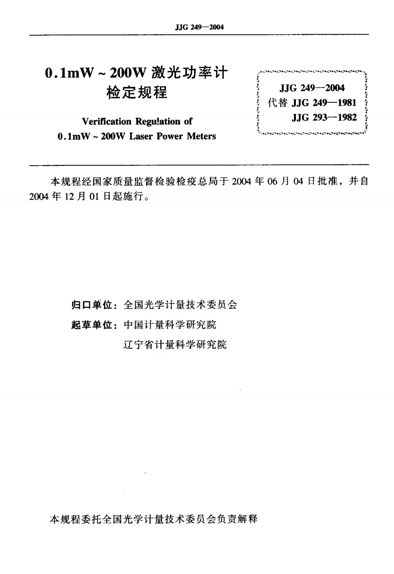 JJG249-20040.1mW~200W激光功率计348072@abc4个月前发布关注私信0.36MB19页024JJG249-20040.1mW~200W激光功率计此内容为付费资源,请付费后查看¥16¥23黄金会员免费钻石会员免费立即购买您当前未登录!建议登陆后购买,可保存购买订单付费资源 第1页 / 共19页 第2页 / 共19页 试读已结束,还剩17页,您可下载完整版后进行离线阅读 THE END标准规范 文本预览 可G中华人民共和国国家计量检定规程JJG249-20040.1mW~200W激光功率计0.1mW~200W Laser Power Meters2004-06-04发布2004-12-01实施国家质量监督检验检疫总局发布 查看更多 收起部分 喜欢就支持一下吧收藏