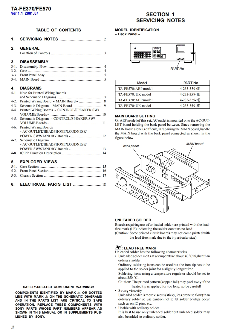 TA-FE370/FE570SERVICE MANUALAEP ModelUK ModelVer.1.22006.02Photo:TA-FE570SPECIFICATIONSAmplifier sectionGeneralDIN power outputSystemTA-FE570:110W+110WPower amplifier with all stages directly coupled(4 ohms at 1 kHz)Preamplifier:Low-noise,equalizerTA-FE370:70W+70Wamplifier(4 ohms at 1 kHz)Power requirements230 VAC.50/60 HzPower consumption±l.0dBTA-FE570:190WTUNER,CD,AUX,TAPEI/DAT,TAPE2/MD:TA-FE370:160W"7-70kH业dB06V(In standby mode)S/N(network A)PHONO:80dBDimensions (approx.)(w/h/d)TUNER,CD,AUX,TAPEI/DAT,TAPE2/MD:430x135x310m105dBincl.projecting parts andcontrokst2trolageimpeda8,200mV,I kilohmMass(approx.)PHONES:5 mW (at 8 ohms)TA-FE570:6.5kgTA-FE370:5.5kgSpeakers impedance 4-16 ohmsSupplied accessoriesDamping factor80(8 ohms,1 kHz)Remote commander (remote)RM-S325 (1)Sony batteries R6 (size-AA)(2)INTEGRATED STEREO AMPLIFIER9-873-838-13Sony Corporation2006B05-1Home Audio Division©2006.02Published by Sony Techno Create CorporationSONY