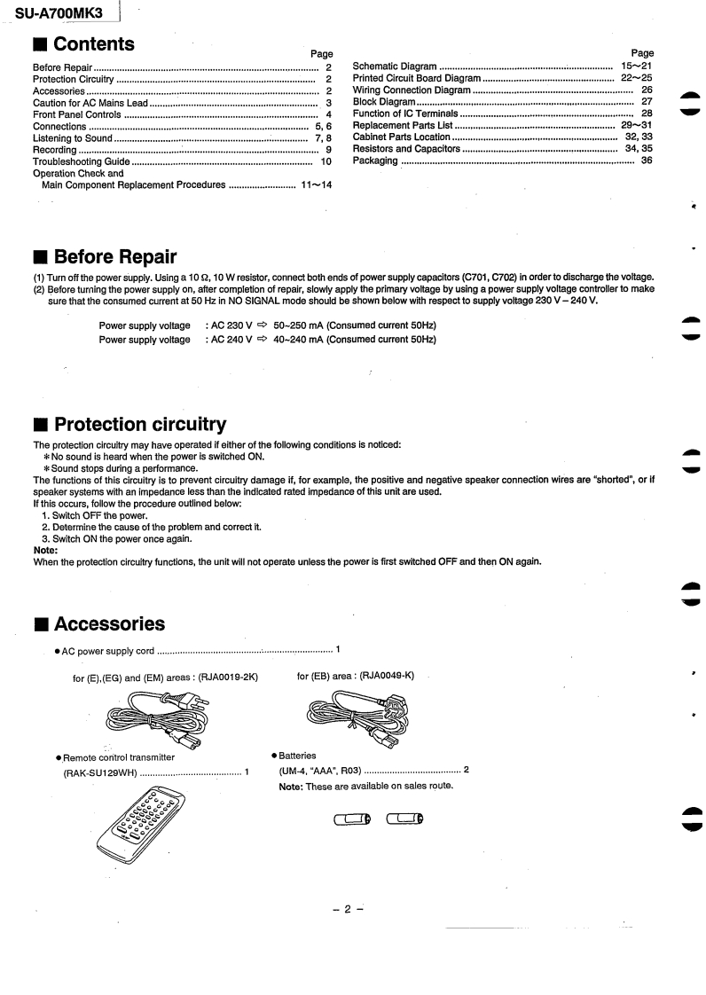 ORDER NO.AD9605130C2Service ManualStereo Integrated AmplifierAmplifierSU-A700MK3Colour (K)....Black TypeAreas(.Europe(EB)Great Britain(EG)............Germany and ltaly(EM)............SwitzerlandSpecifications(DIN 45 500)20 Hz-20 kHz contlnuous power output both channels drivenS/N at -26 dB power (4 ohm)·2×45W(8ohmPHONO MM,68 dB1 kHz continuous power output both channels driven(THD:1%)TUNER,CD,AUX,TAPE 1,TAPE 2/DCC,70 dB2×55W(8ohm,2×80W(4ohm)S/N at 50 mW power (4 ohm)63 Hz-12.5 kHz continuous power output both channels drivenPHONO MM,64 dB(THD:0.7%)TUNER,CD,AUX,TAPE 1,TAPE 2/DCC,64 dB2×50W(8ohm).2×70W(4ohmFrequency responseTotal harmonic distortion rated power at 20 Hz-20 kHzPHONO MM,RIAA standard curve +1 to-1 dB (30 Hz-15 kHz)0.01%8ohm)TUNER,CD,AUX,TAPE 1,TAPE 2/DCCIntermodulation distortion(50 Hz:7 kHz =4:1,SMPTE)3Hz-80kH2(+0,-3dB)20Hz-20kHz(40,-0.3dB)rated powerTone controls0.007%(8ohmBASS,50 Hz,+10 to-10 dBResidual hum and noiseTREBLE,20 kHz,+10 to -10 dB1mVOutput voltageDamping factorTAPE 1,TAPE 2/DCC REC OUT,150 mV60(8ohm).30(4ohm)Channel balance (AUX 250 Hz-6.3 kHz),+1 to -1 dBHeadphones output level/impedanceChannel separation (AUX 1 kHz),50 dB540 mV/330 ohmLoad impedanceGENERALA or B,4-16 ohmPower consumption,200 WA and B,8-16 ohmPower supplyInput sensitlvity/impedanceFor (E),(EG),and (EM)areas,50 Hz AC,230 VPHONO MM,2.5 mV/47 k ohmFor (EB)area,50 Hz AC,230 V-240VTUNER,CD,AUX,TAPE 1,TAPE 2/DCC,150 mV/22 k ohmDimensions,430 (Wide)/125 (High)/318 (Depth)mmPhono maximum input voltage (1 kHz,RMS)Weight,6.7 kgMM,150 mV(150 mV.IHF'66)S/N (rated power,4 ohm)Notes:PHONO MM,76 dB (78 dB,IHF '66)1.Specifications are subject to change without notice.TUNER,CD,AUX,TAPE 1,TAPE 2/DCCWeight and dimensions are approximate.91 dB (99 dB,IHF '66)2.Total harmonic distortion is measured by the digital spectrum analyzerWARNINGThis service information is designed for experienced repair technicians only and is not designed for use by the general public.It does notcontain warnings or cautions to advise non-technical individuals of potential dangers in attempting to service a product.Products powered by electricity should be serviced or repaired only by experienced professional technicians.Any attempt to service orrepair the product or products dealt with in this service information by anyone else could result in serious injury or death.1996 Matsushita Electric Industrial Co.,Ltd.TechnicsAll rights reserved.Unauthorized copyingand distribution is a violation of law.