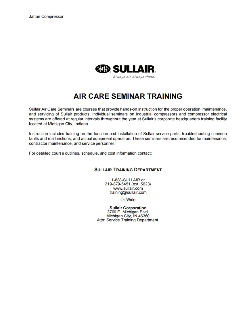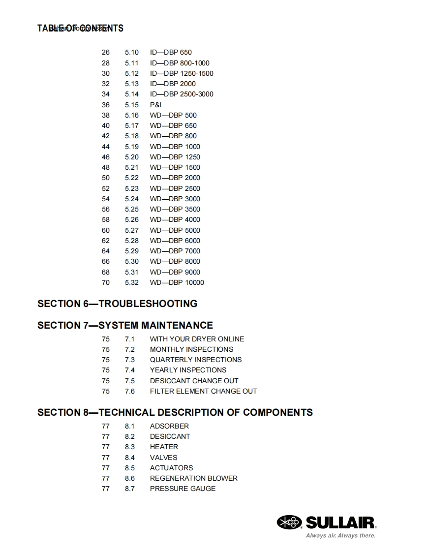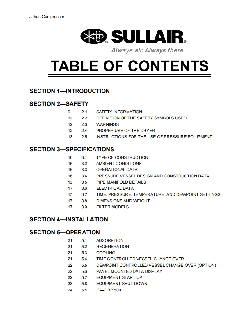 Jahan CompressorSULLA RAlways air.Always there.USER/SERVICE MANUALDESICCANT BLOWER PURGEREGENERATIVE DRYERDBP SERIES(800-10,000 CFM)福◇hPART NUMBER:02250195-405R00KEEP FORFUTUREWARRANTY NOTICEREFERENCEFailure to follow the instructionsSULLAIR CORPORATIONand procedures in this manual or,The information in this manual is currentmisuse of this equipment willas of its publication date,and applies tocompressor serial number:VOID its warranty!SBPIABIABA-0001and all subsequent serial numbers.