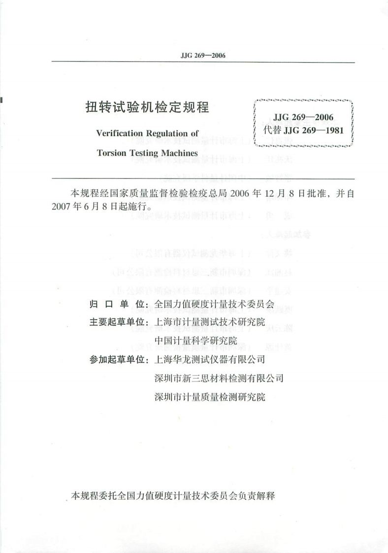 JJG269-2006扭转试验机348072@abc4个月前发布关注私信2.87MB16页033JJG269-2006扭转试验机此内容为付费资源,请付费后查看¥16¥23黄金会员免费钻石会员免费立即购买您当前未登录!建议登陆后购买,可保存购买订单付费资源 第1页 / 共16页 第2页 / 共16页 试读已结束,还剩14页,您可下载完整版后进行离线阅读 THE END标准规范 文本预览 可可G中华人民共和国国家计量检定规程JJG269-2006扭转试验机Torsion Testing Machines2006-12-08发布2007-06-08实施国家质量监督检验检疫总局发布 查看更多 收起部分 喜欢就支持一下吧收藏