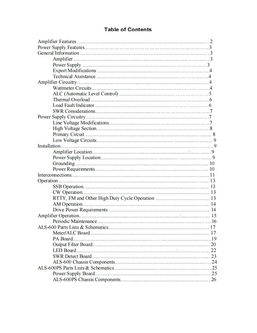 AMERITRON ALS-600600 WATT NO TUNETMOS-FET AMPLIFIERINSTRUCTION MANUALThe Ameritron ALS-600 is a 600 watt output,solid state,linear amplifier using state-of-the-art,high voltage,RF TMOS FET devices in the power output section.TheALS-600 provides continuous frequency coverage from 1.5 through 22 MHz with notuning adjustments.Broad band 5 pole low pass filters provide output harmonicsuppression in excess of all FCC requirements.Export modifications are available toextend operation up to 30 MHz with a copy of a valid amateur license.The ALS-600 uses four MRF-150 FETs operating a 50 volts in a double endedpush-pull parallel output configuration.High quality RF components combine withan accurate peak detecting directional coupler,front panel adjustable ALC circuitwith automatic SWR fold-back,and one switch frequency selection to make this oneof the easiest to operate amplifiers available.The matching power supply,ALS-600PS,is shipped factory wired for 120 volt,50/60 Hz power mains and is easilyconverted to other supply voltages between 100 and 240 volts.PLEASE READ THIS MANUAL BEFORE OPERATING THIS EQUIPMENTAM云习的116 Willow RoadStarkville,MS 39759 USA662-323-8211Version 2 Printedin U.S.A.