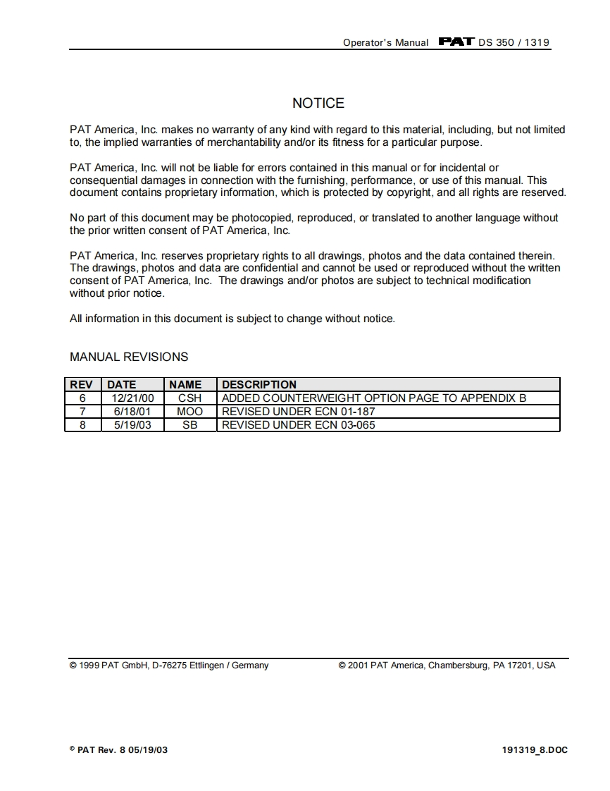 PAT America,Inc.www.patamerica.comPATPLOAD MOMENT INDICATORDS 350/1319 GraphicPAT DS 3500335☒T156t回794回450.8t下乙品[为的[49的回回OPERATOR'S MANUALP/N050-350-191-319REV8,05/19/2003PAT Rev..805/19/03191319_8.D0C