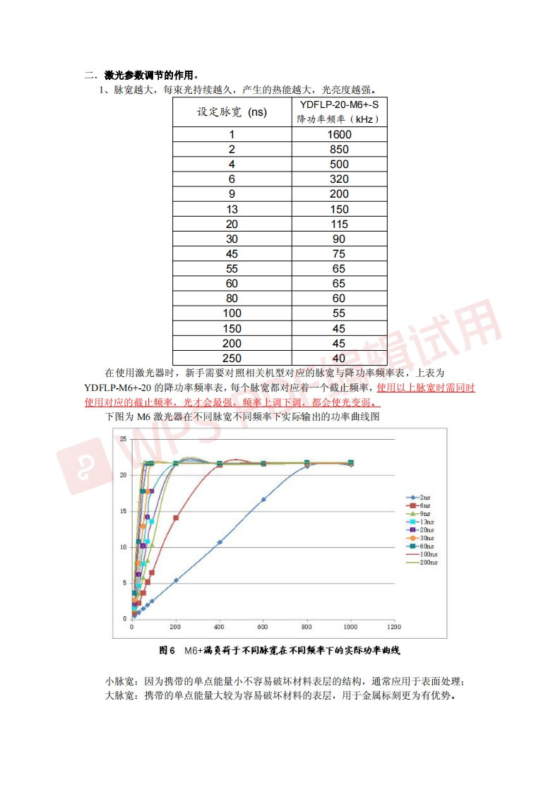 MOPA激光器应用说明一,名词解释142ns除宽的峰值功率200ns除宽的哈值功有1210营色所涂部分为200s屏克携管的传量-200nsP/kW 6-100ms20ns2ns红色所涂部分为2s除意携带的能量-201070100130160220250-2200ns,宽t/ns2ns宽YDFLP-20-M6-S部分波形曲线图1、频率(khz):激光器每秒钟发射出多少束光(即每秒钟多少个脉冲打在材料上)。2、脉宽(s):指每一束光发射(持续)多久(即一个脉冲持续的时间)。1s=1000ms=1000,000us=1000,000,000ns3、功率(百分比):软件上所调的功率百分比并非激光器实际输出值,应该在理论计算值附近。。4、脉冲能量:指一个脉冲携带的能量,能量越大散发的热量越多(即一个脉冲点携带的热量,也可以形象的比喻为一座山的体积大小)。5、峰值功率:指这个脉冲波形能达到的最大功率(就像一座山有它的顶峰一样)。6、光束质量:用于评判一束光的能量聚焦好坏的参数指标,即MP因子,它与这束光的束腰半径00,及发散角日有关,M2越大光斑质量越糟糕,不适合做精细加工。東腰数日0光束参数乘积BPp-w。·0衍射系数M2=%0·天转换M=BPp,天