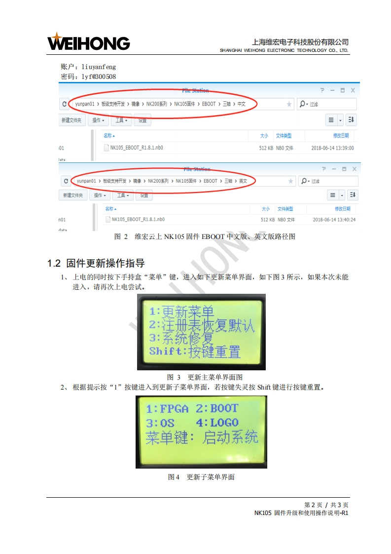 WEIHONG上海维宏电子科技股份有限公司SHANGHAI WEIHONG ELECTRONIC TECHNOLOGY CO.,LTD.NK105固件升级和使用操作说明版次:2018年7月6日第1版作者:硬件平台上海维宏电子科技股份有限公司版权所有1固件升级操作说明1.1准备工作更新固件前,查看所使用的U盘格式。首先,尽量保证所使用的U为品牌产品:其次,查看所使用的U盘格式是否为FAT32,若不是,请将U盘格式化为FAT32:最后将需要更新的固件拷贝到U盘根目录下(所谓根目录是指U盘第一级目录,不要将固件放到U盘下面的任何文件夹中)。可移动磁盘仟:)属性X常规工具硬件共享自定义类型:可移动磁盘文件系统FAT32■已用空间:405,741,568字节386MB■可用空间:14,490,460,160字节13.4GB容里14,896,201,728字节13.8GB驱动器H:确定「取消应用A)图1U盘所支持的文件系统格式查看图对不在公司的同事,可选择从维宏云盘上取NK105的EBOOT固件,其路径如下图2所示:http://pan.weihong.com.cn:5533/webman/index.cgi第1页/共3页NK105固件升级和使用操作说明-R1