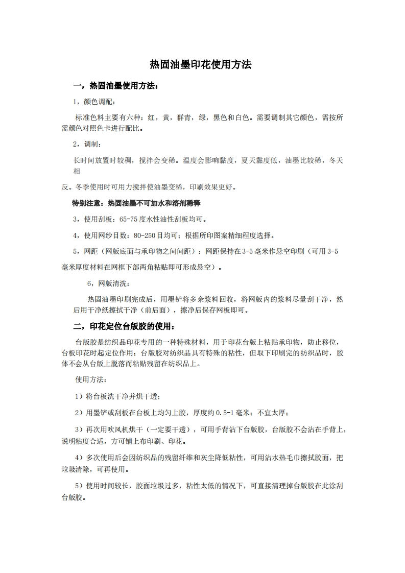 热固油墨丝网印刷T恤类产品基本操作方法热固油墨又称塑胶油墨,或不干胶油墨,是目前T恤印花中比较高端的一种印花材料,该油墨印制的图案色彩艳丽,手感柔软,透气性好。热固油墨是非溶剂型油墨,是通过加热后,粉料与助剂之间溶解塑化渗入纤维与布料紧密粘连形成牢固的膜。此种油墨没有任何气味,不高温加热不会凝固,保质期长,是一款非常环保的印花材料。因固化温度不同,热固油墨又可以分为高温和低温两类。一,热固油墨可印刷产品:100%棉、棉/涤混纺、涤纶、深浅色布、牛仔布等各种织物。1,适用于热固油墨印刷的织物必须具备以下二个条件A:可耐150度高温:B:有透气性,可以使油墨渗透进去不适合的承印物比如:塑料、金属、玻璃等以及经防水处理的尼龙布2,优点:热固油墨可印刷精细图案,丝印后的图案手感柔软,色彩鲜艳,透气性好:该油墨没有任何气味(胶浆材料气味较大),非常环保,保存方便,常温保存不凝固,随用随取,即使多日放置在网框内也不会凝固,不会和胶浆一样发生堵版的情况。热固油墨是需要加热110-150度左右烘干1分钟左右固化,可使用烘干机,烫画机或高温热风枪进行固化。特别提示:所印产品必须能够承受150度方可使用热固油墨(一般的纺织品均可使用,防雨绸等纯化纤产品不可使用)二,印刷流程:1,将台版胶涂刮在台版上(具体操作见附件1-6说明)2,将T恤套在台版上(按制版对位时放置T恤的大体位置)3,将网板夹在丝印机夹头上:并调整网版图案在T恤上的位置:4,将网版彻底夹住锁定(注意:网版底面与T恤面间隔3-5毫米,见附件1-5说明)5,将调制好的油墨刮入网框内:6,使用刮板从靠近夹头处刮向身体处:7,将刮板靠在网版夹头处:8,抬起网框,取下T恤,印刷完成。