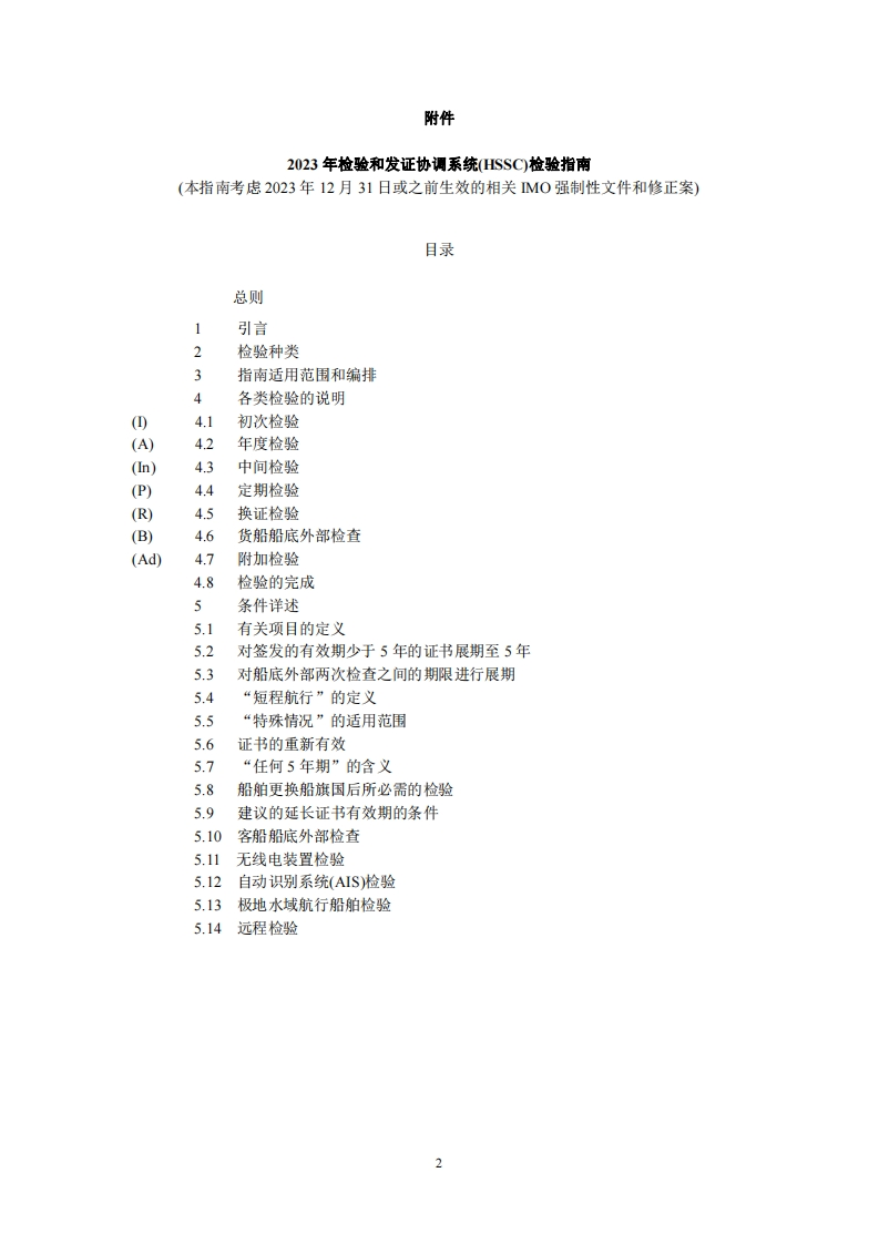大会A1186(33)决议(2023年12月6日通过)2023年检验和发证协调系统(HSSC检验指南大会,忆及国际海事组织公约第15)条关于大会在海上安全及防止和控制船舶造成海洋污染的规则和指南方面的职能,还忆及:(a)1988年国际检验和发证协调系统大会通过的《1974年国际海上人命安全公约1988年议定书》和《1966年国际载重线公约1988年议定书》,特别将检验和发证协调系统分别纳入《1974年国际海上人命安全公约》以及《1966年国际载重线公约》:(b)MEPC.39(29)决议通过的修正案,将检验和发证协调系统纳入经1978年议定书修订的《1973国际防止船舶造成污染公约》(MARPOL):(c)MEPC.132(53)决议通过的修正案,将检验和发证协调系统纳入MARPOL附则VI:(d)国际船舶压载水管理大会通过的《2004年国际船舶压载水及沉积物控制和管理公约》,其包括检验和发证协调系统:和(©)下列决议通过的修正案,将检验和发证协调系统纳入:(①)《国际散装运输危险化学品船舶构造和设备规则》(IBC规则)MEP℃.40(29)决议和MSC.16(58)决议):()《国际散装运输液化气体船舶构造和设备规则》1GC规则)MSC.17(58)决议):和(ii)《散装运输危险化学品船舶构造和设备规则》BCH规则)MEP℃.41(29)决议和MSC.18(58)决议进一步忆及在连续废除A.1140(31)A.1120(30)、A.1104(29)、A.1076(28)、A.1053(27)、A.1020(26)、A.99725)、A.948(23)和A.746(18)决议之后,大会A.1156(32)决议通过的《2021年检验和发证协调系统HSSC)检验指南》(以下简称“检验指南”),以替代A.560(14)、MEPC.11(18)和MEPC.2523)决议通过的指南,认识到鉴于自A.1156(32)决议通过以来上述IMO文件的各修正案的生效或实施,以及通过新冠疫情期间获得的经验应用远程检验和高级技术,需要对检验指南作进一步修订,审议了海上安全委员会在其第106届会议上以及海上环境保护委员会在其第79届会议上提出的建议案:1.通过《2023年检验和发证协调系统(HSSC)检验指南》,其文本载于本决议附件:2.提请各国政府在按相关MO文件要求执行检验时实施所附检验指南的规定:3.要求海上安全委员会和海上环境保护委员会对本检验指南保持审议,并在必要时进行修正:4.度除A.115632)决议.